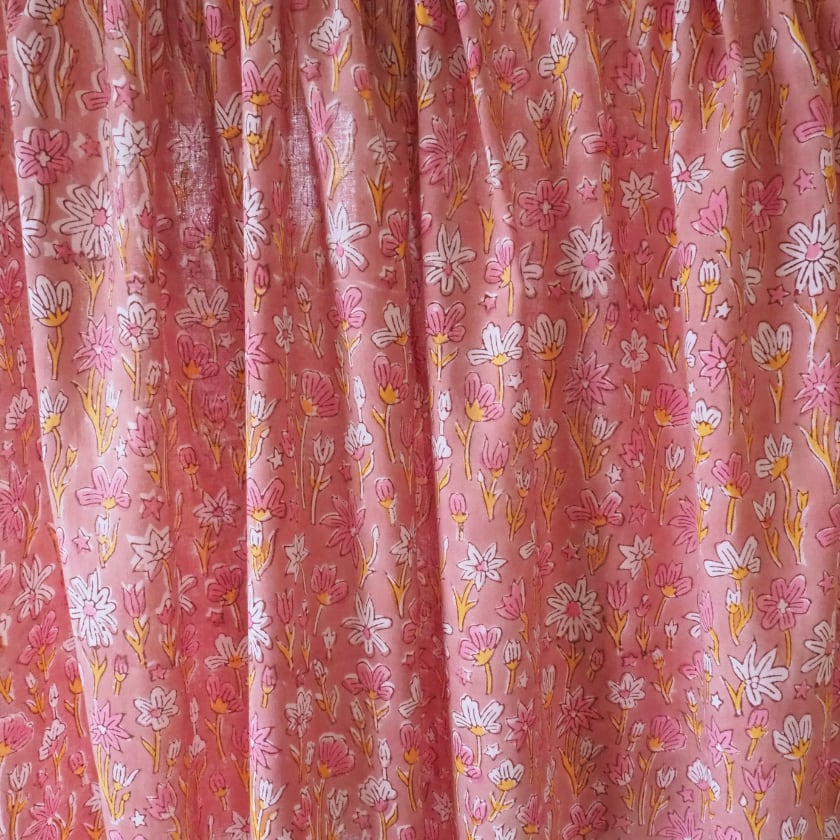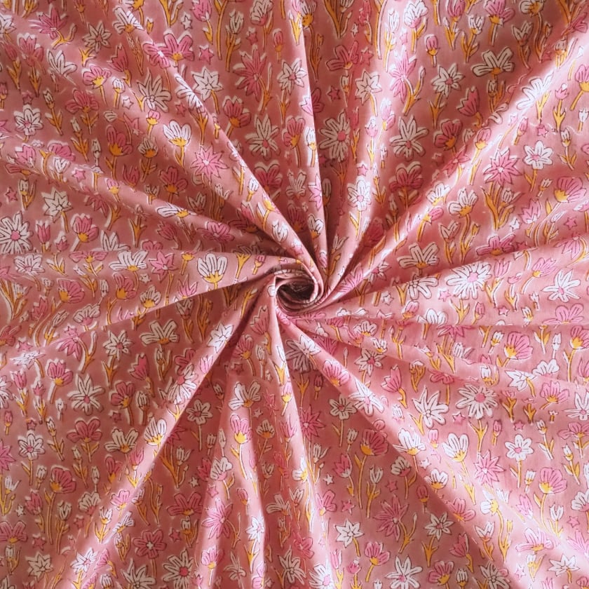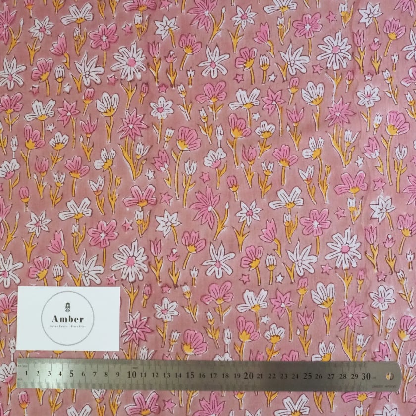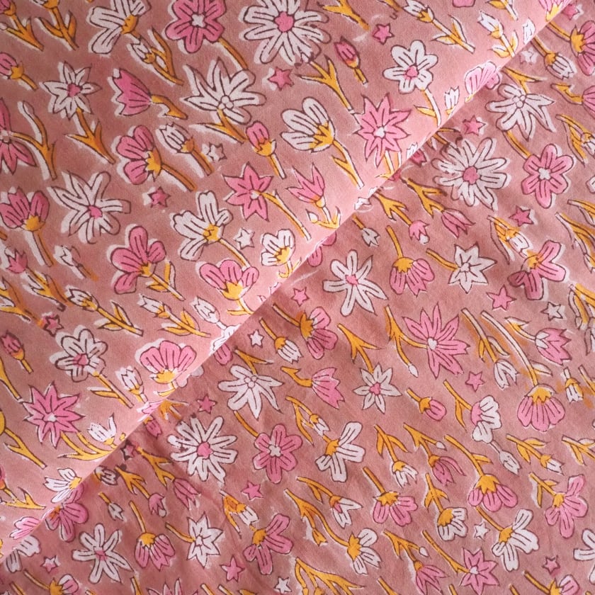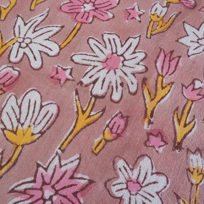 ブロックプリント生地【50cm単位】インド綿 花柄 くすみピンク×イエロー×白 #56124-PK1