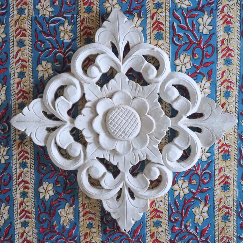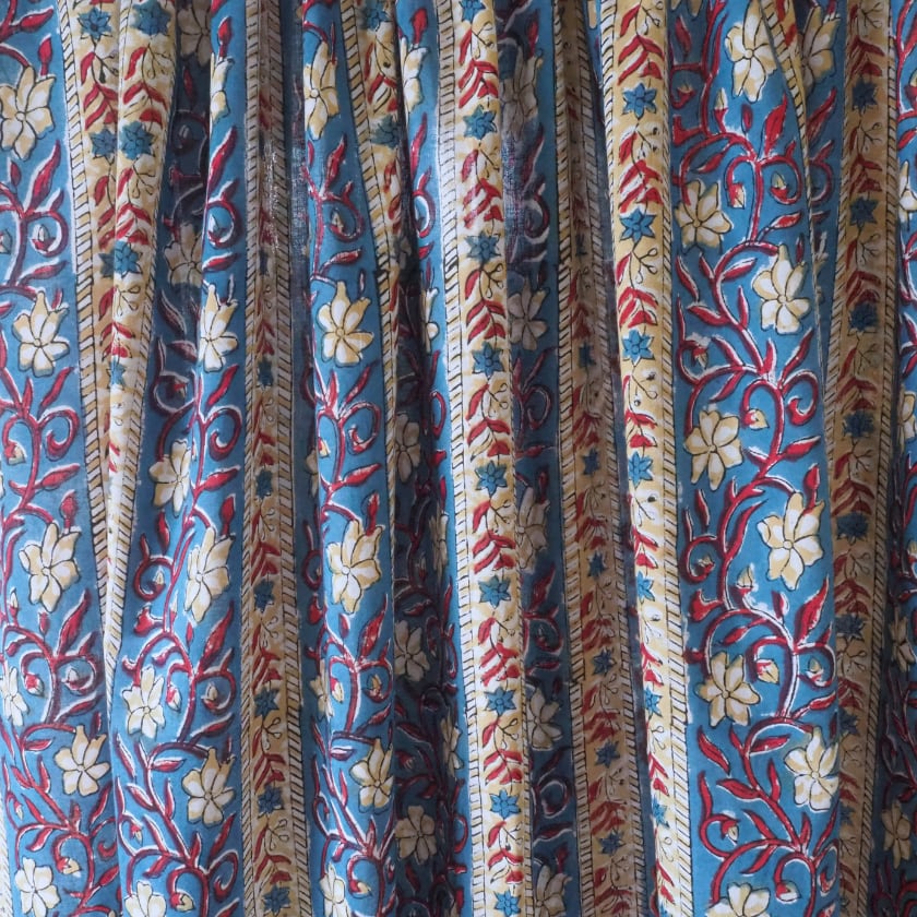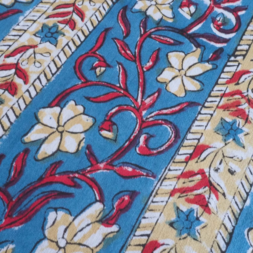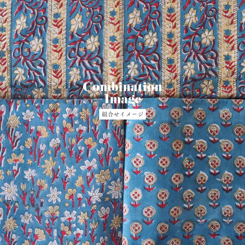 ハンドブロックプリントと呼ばれるインドのジャイプール地方に古くから伝わる伝統的な技法で、木彫りのスタンプで色を何度も重ね、全ての工程がインドの職人さんの手作業によって仕上がるAll Handmadeの生地です。