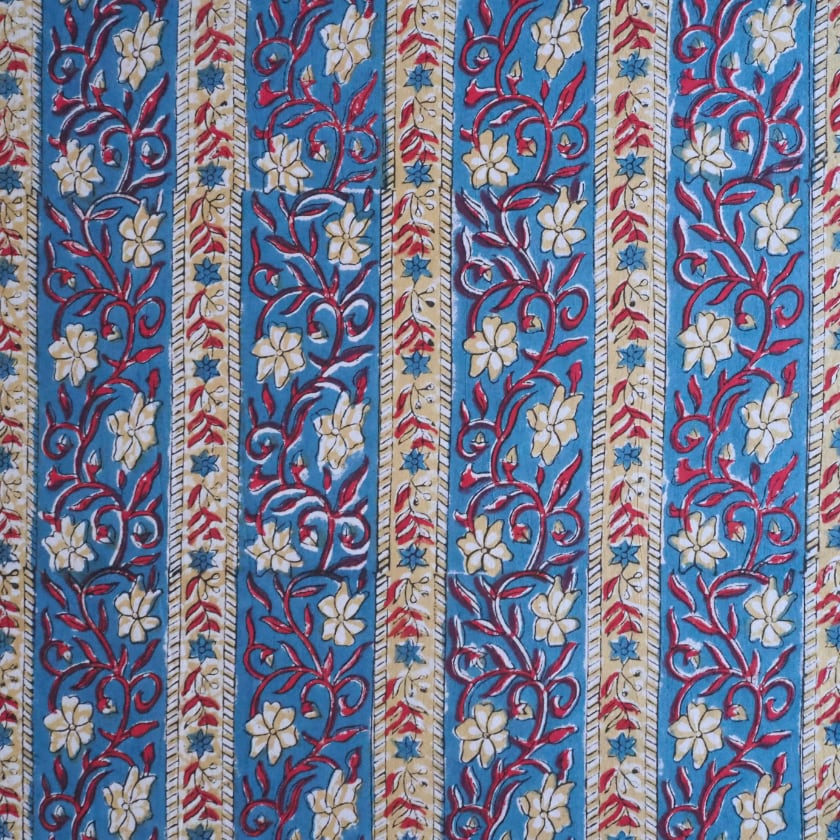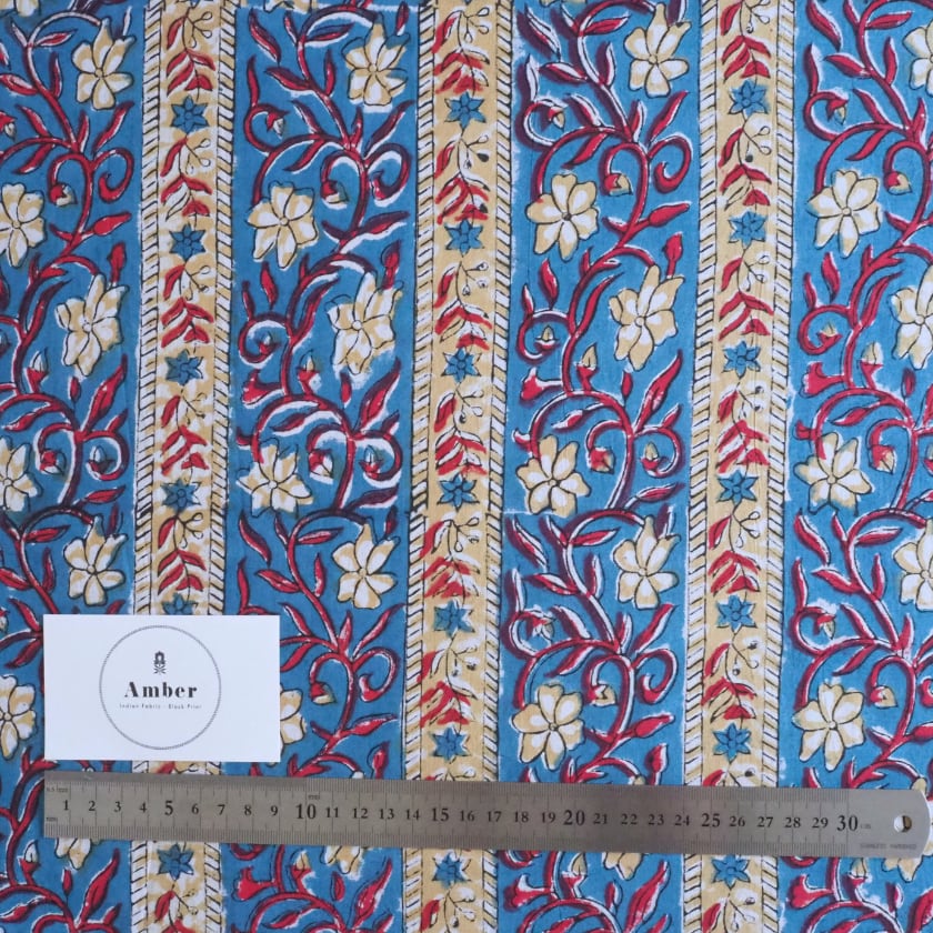 ブロックプリント生地【50cm単位】インド綿 ストライプ柄 ブルー×赤ー×ベージュ #56525-BL3