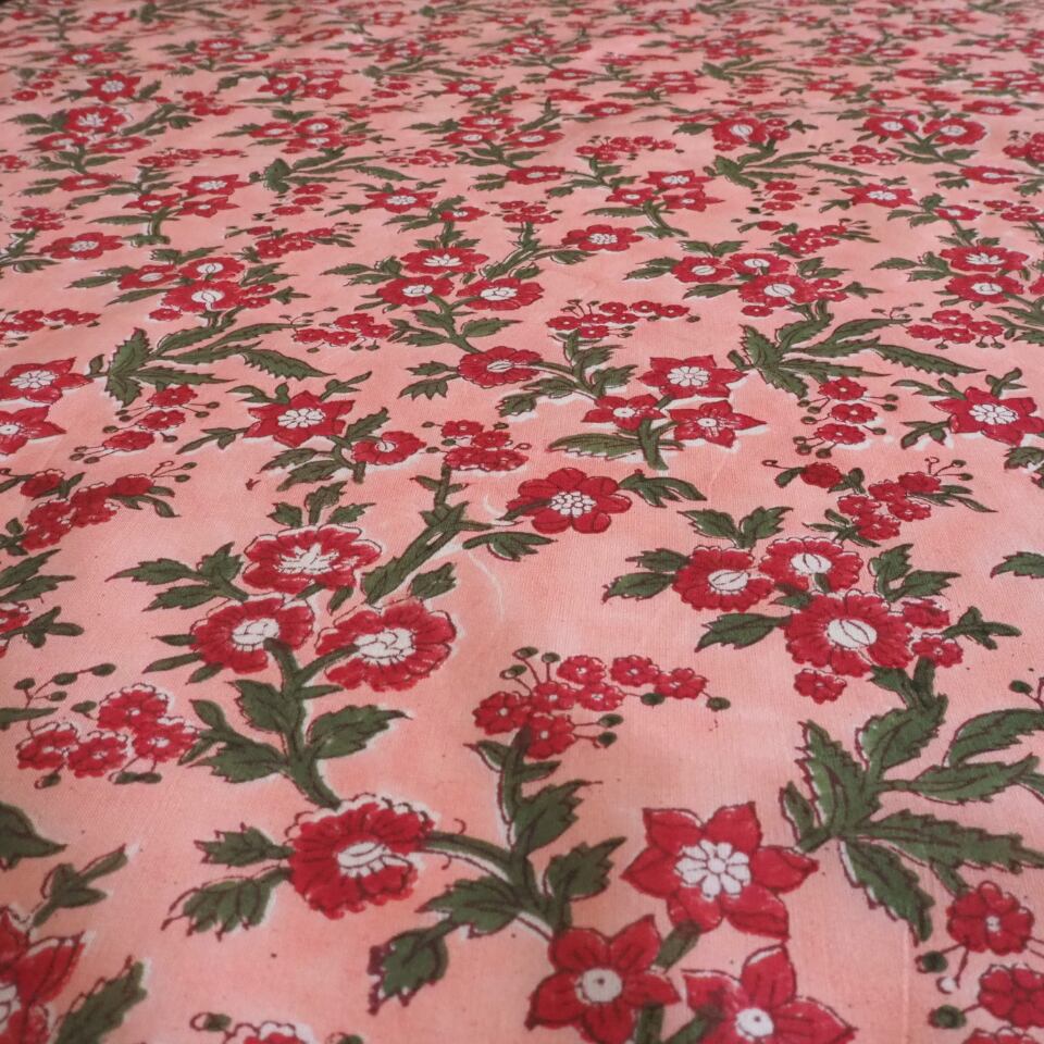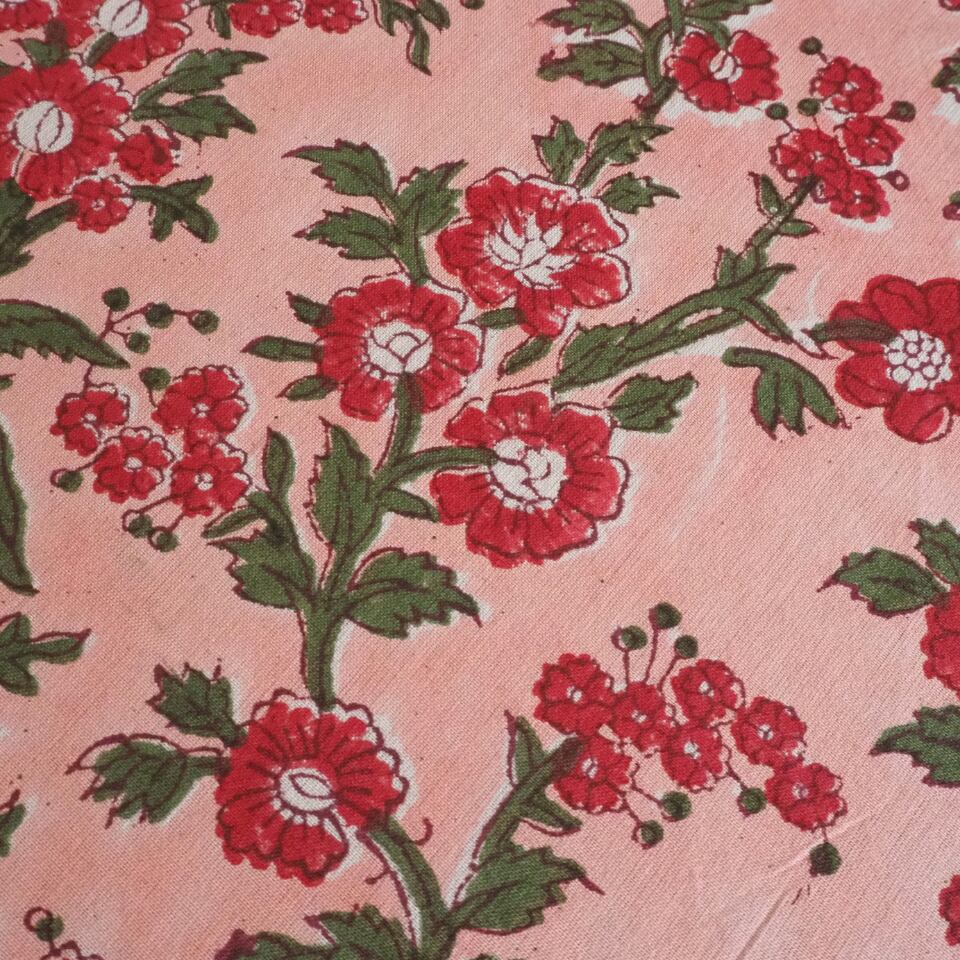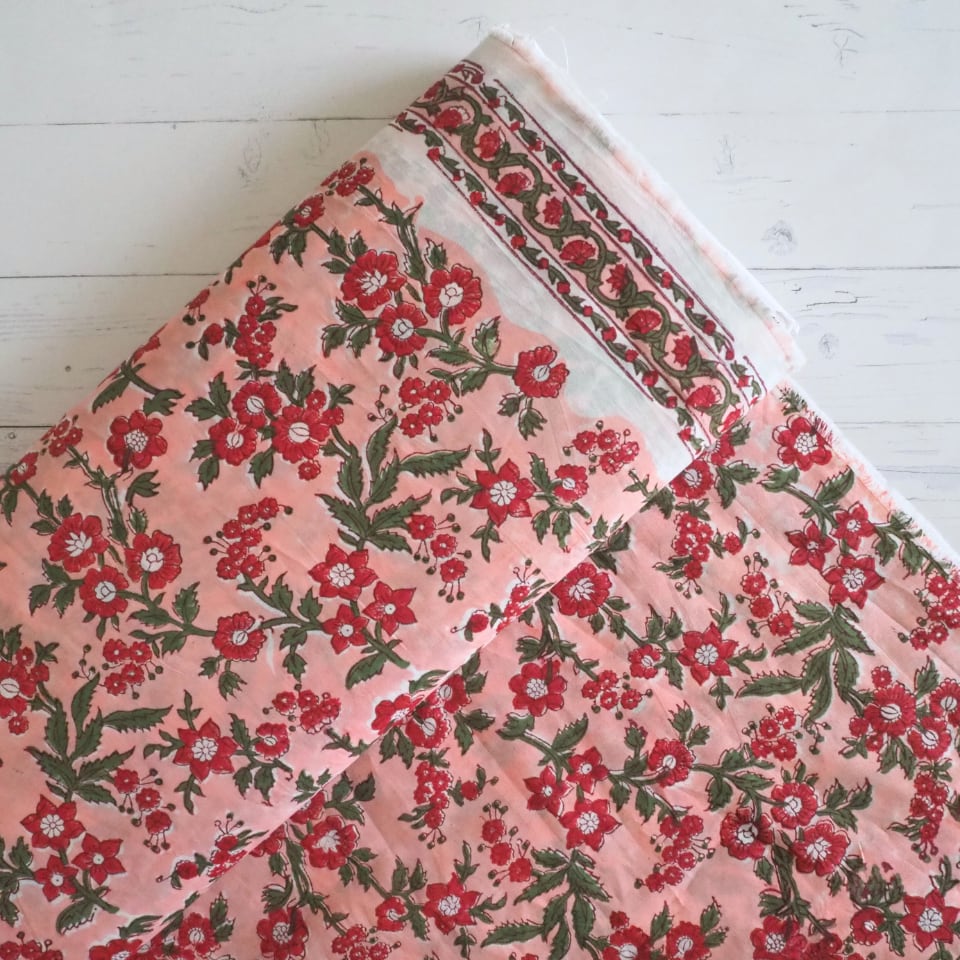 ブロックプリント生地【50cm単位】インド綿 片耳デザイン付き 花柄 ピンク×赤×グリーン #57528-PK3