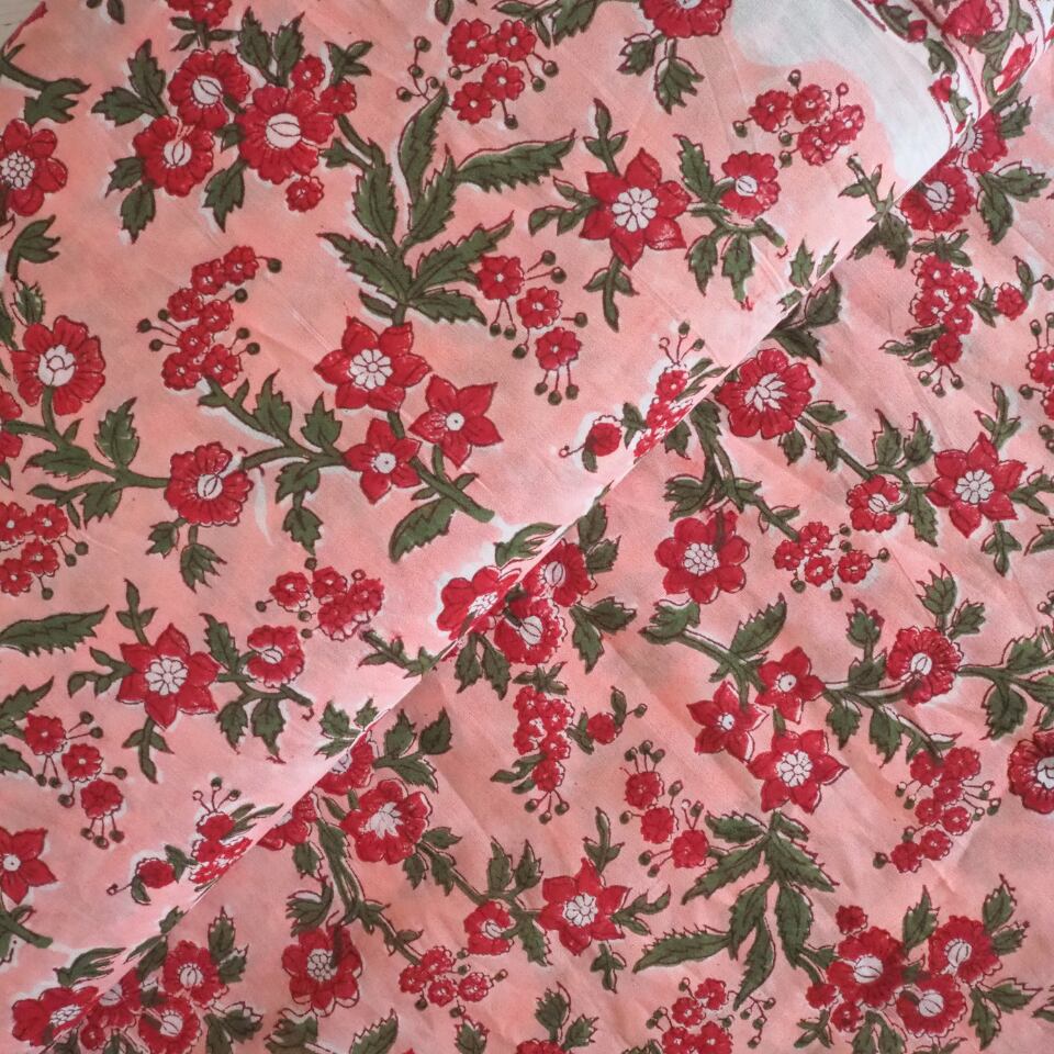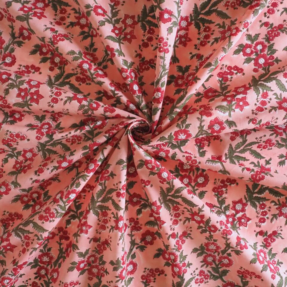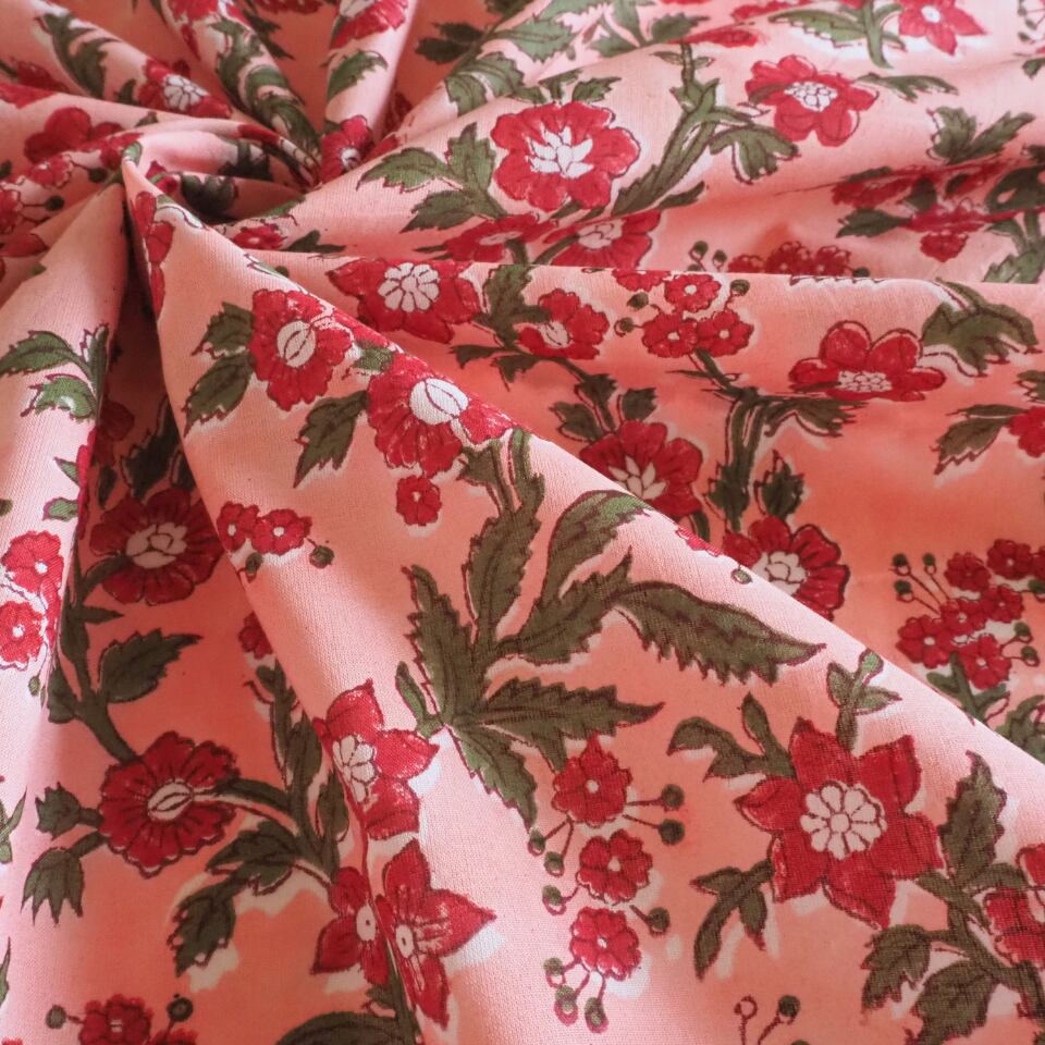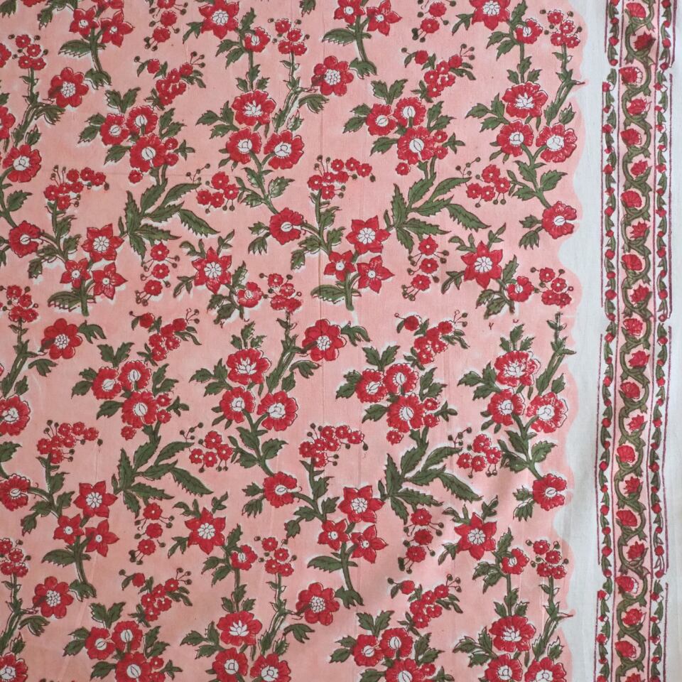 ブロックプリント生地【50cm単位】インド綿 片耳デザイン付き 花柄 ピンク×赤×グリーン #57528-PK3