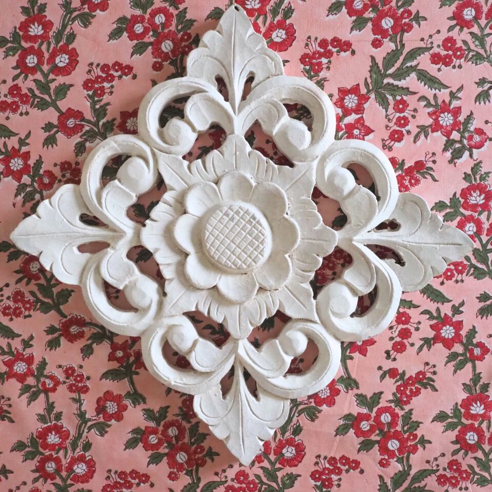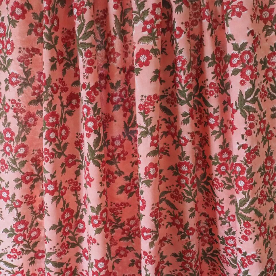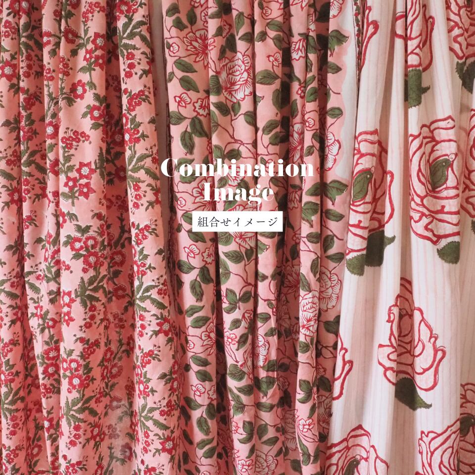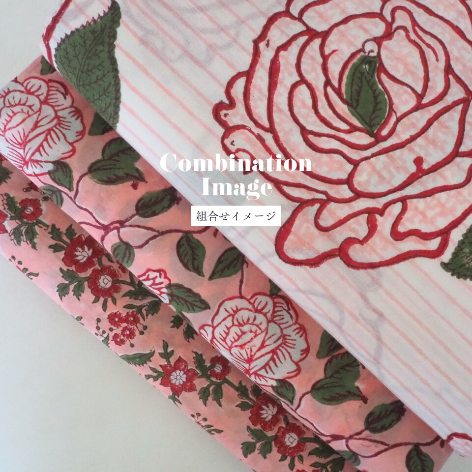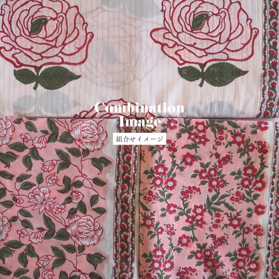 ハンドブロックプリントと呼ばれるインドのジャイプール地方に古くから伝わる伝統的な技法で、木彫りのスタンプで色を何度も重ね、全ての工程がインドの職人さんの手作業によって仕上がるAll Handmadeの生地です。