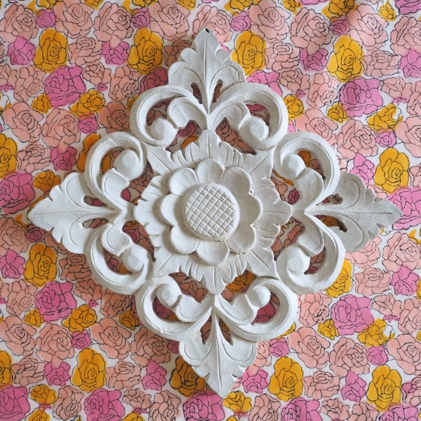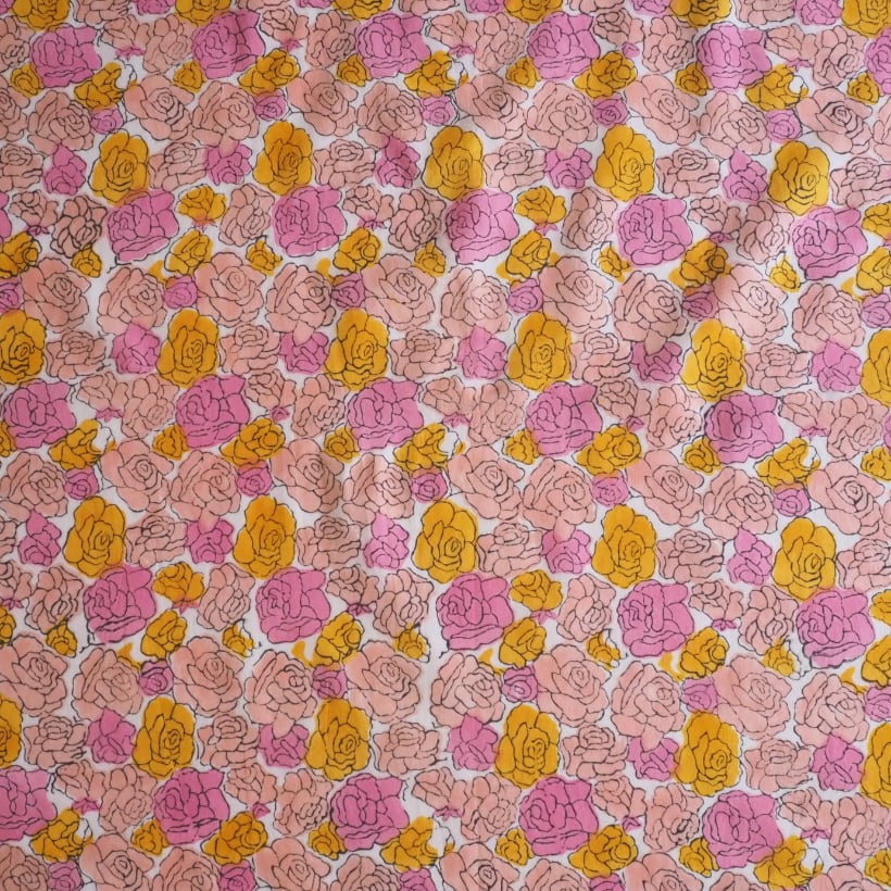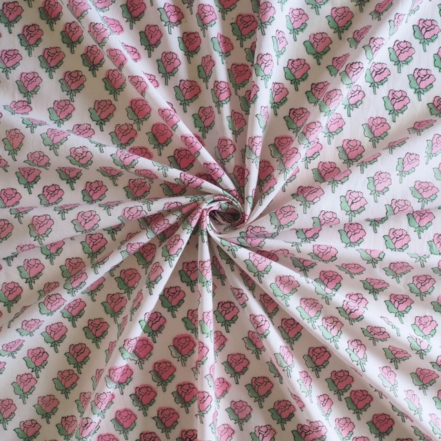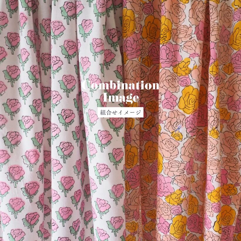 ハンドブロックプリントと呼ばれるインドのジャイプール地方に古くから伝わる伝統的な技法で、木彫りのスタンプで色を何度も重ね、全ての工程がインドの職人さんの手作業によって仕上がるAll Handmadeの生地です。