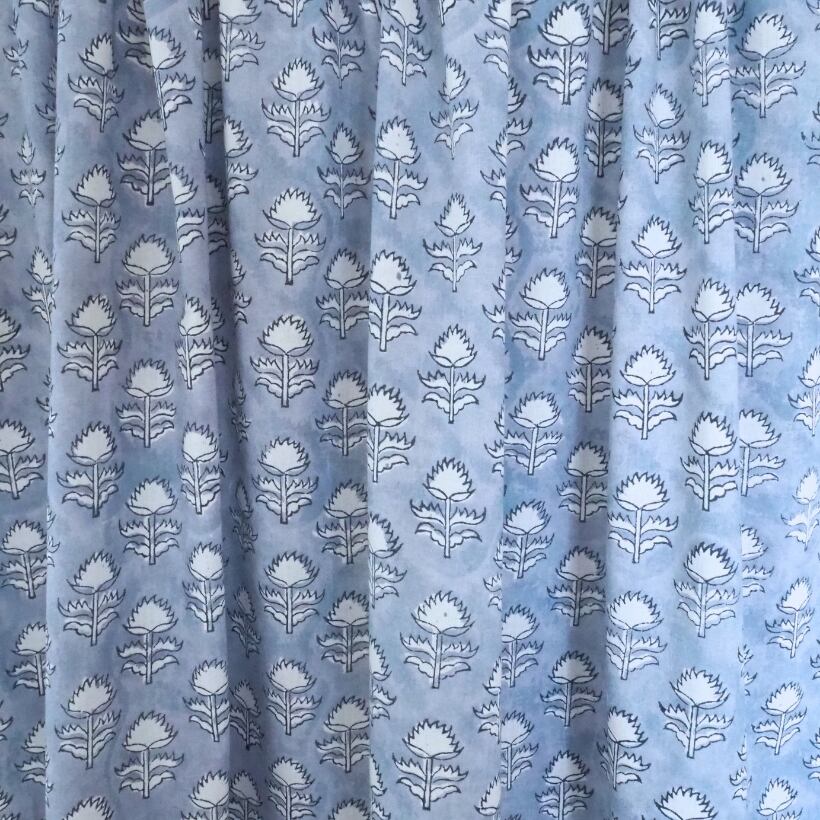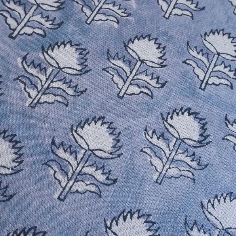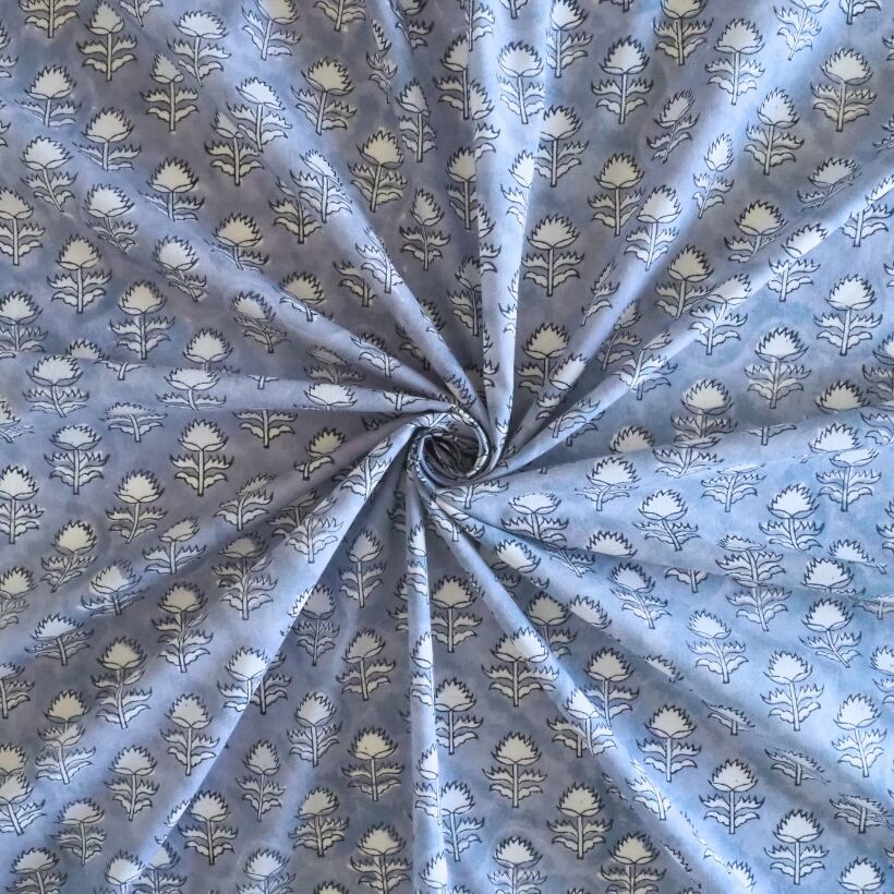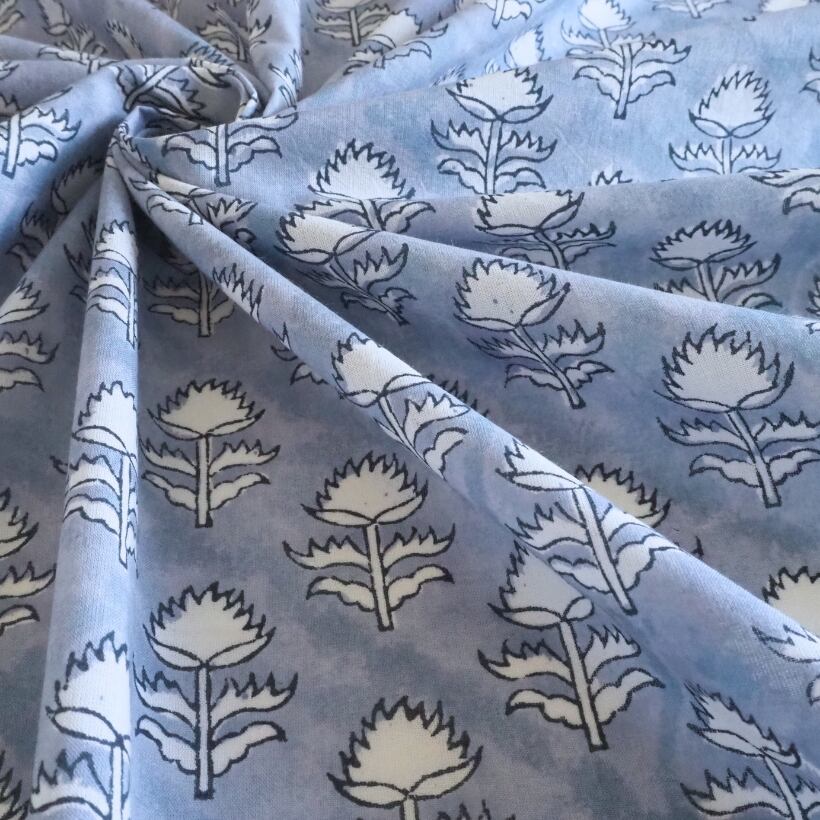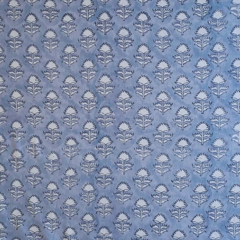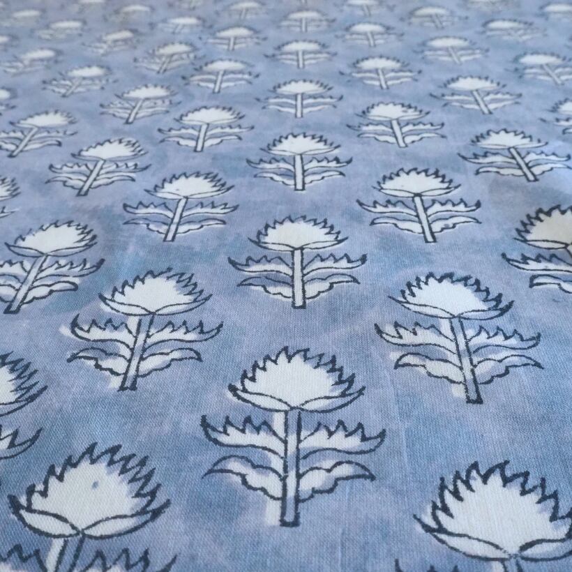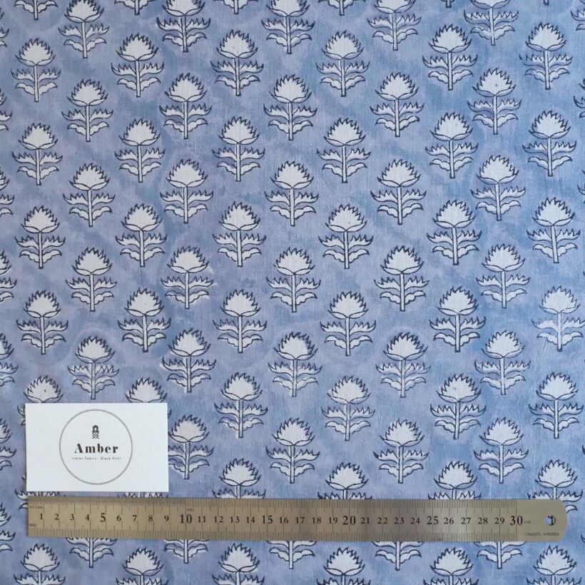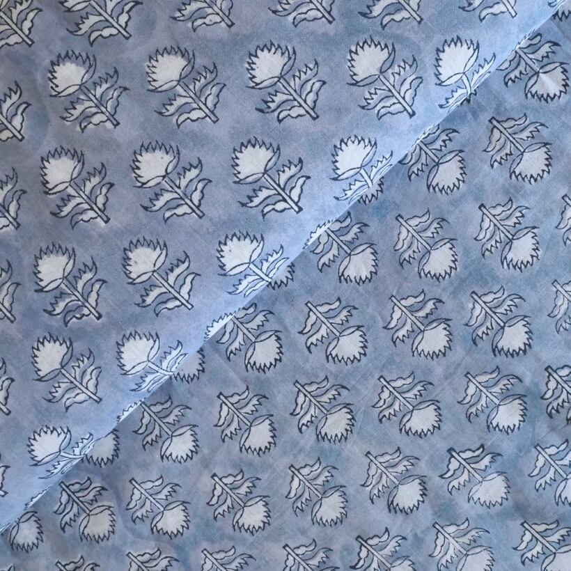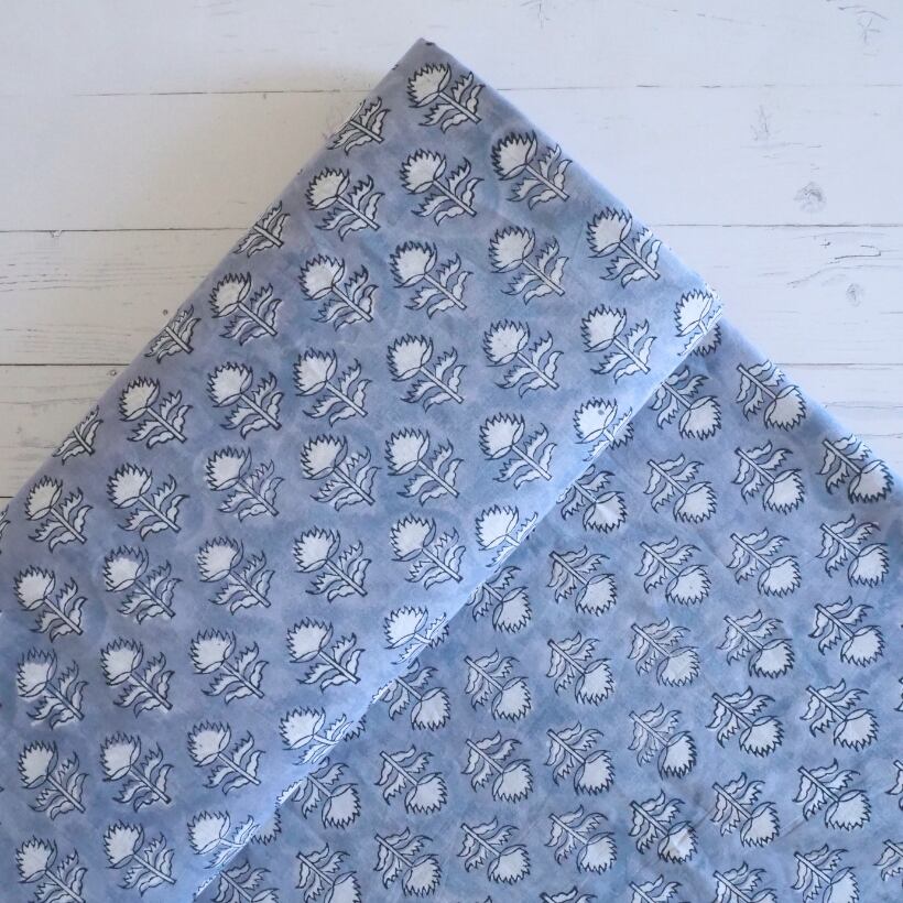 ブロックプリント生地【50cm単位】インド綿 小花柄 くすみブルー×白 #58810-BL1