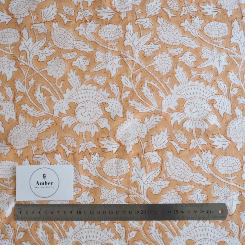 ブロックプリント生地【50cm単位】インド綿 花柄 オレンジ×白 #59410-OR1