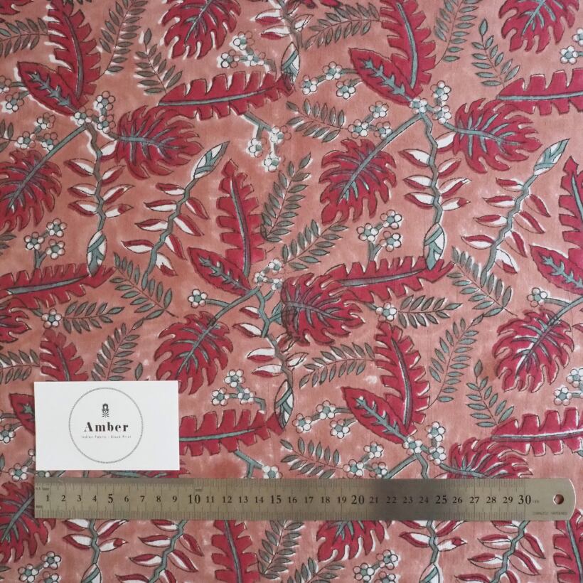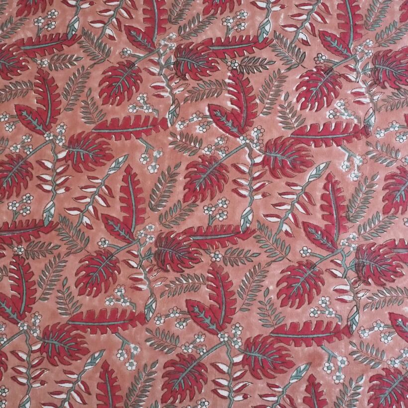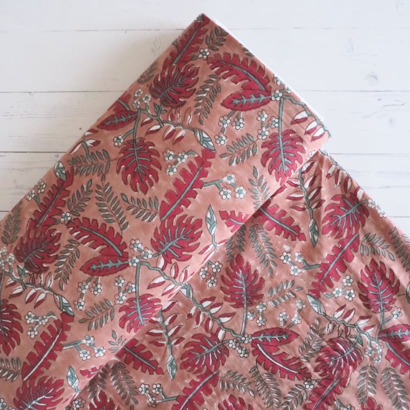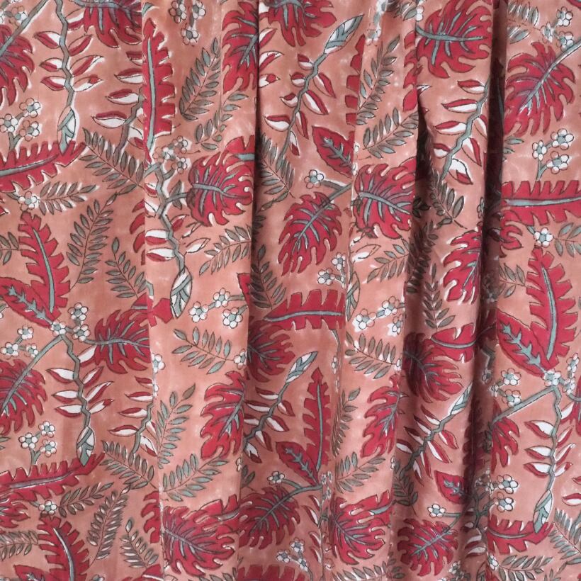 ハンドブロックプリントと呼ばれるインドのジャイプール地方に古くから伝わる伝統的な技法で、木彫りのスタンプで色を何度も重ね、全ての工程がインドの職人さんの手作業によって仕上がるAll Handmadeの生地です。