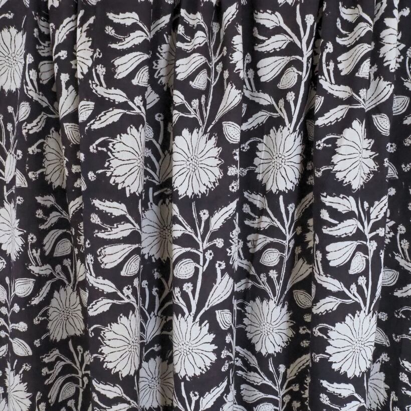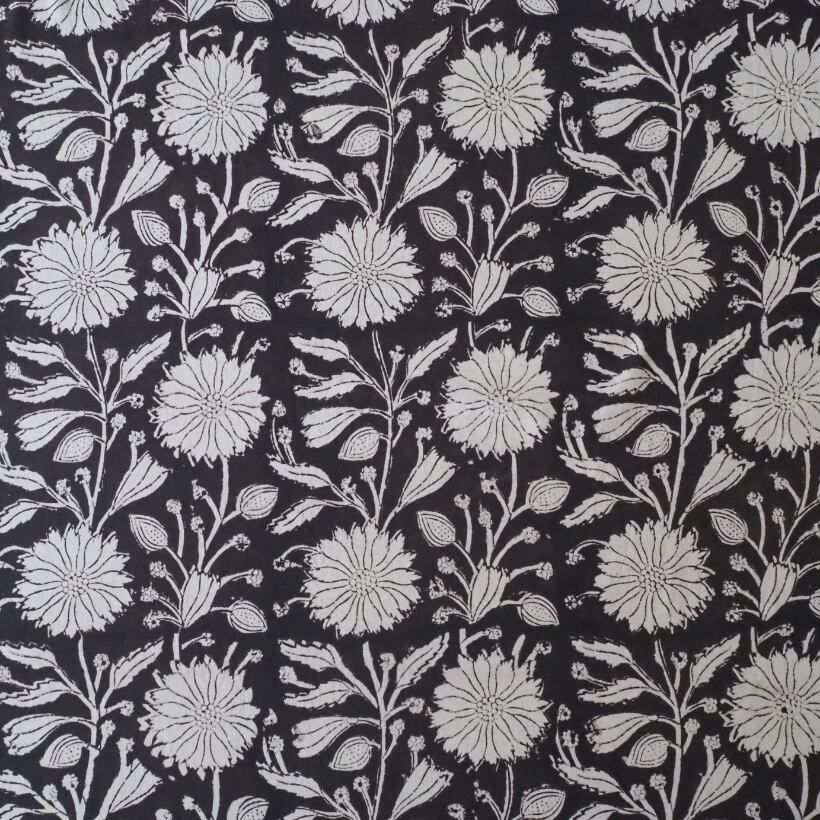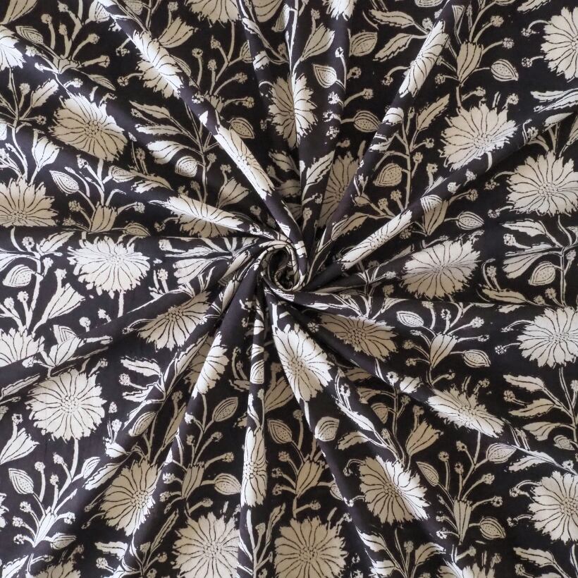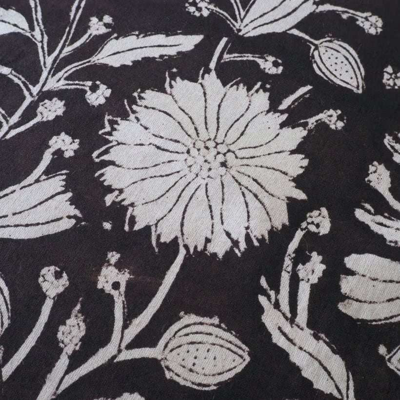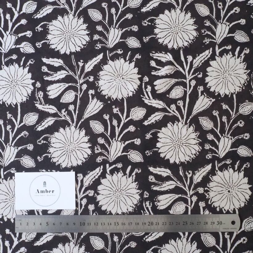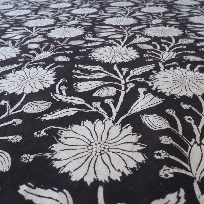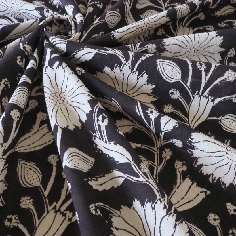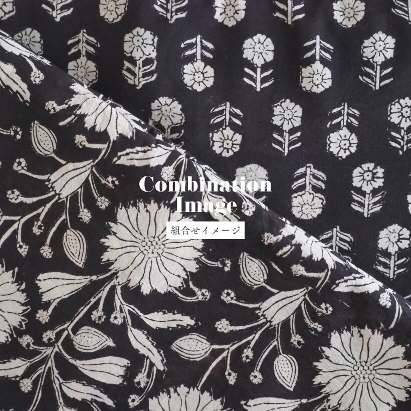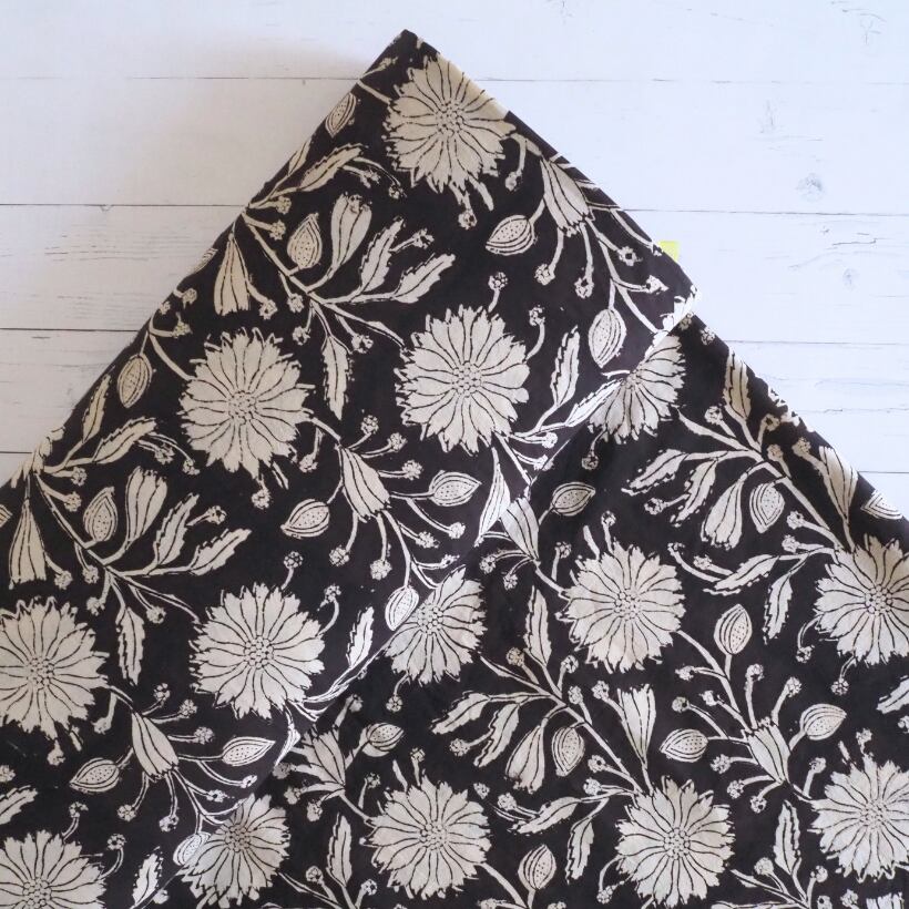 ブロックプリント生地【50cm単位】インド綿 花柄 黒×生成り #59010-BK1