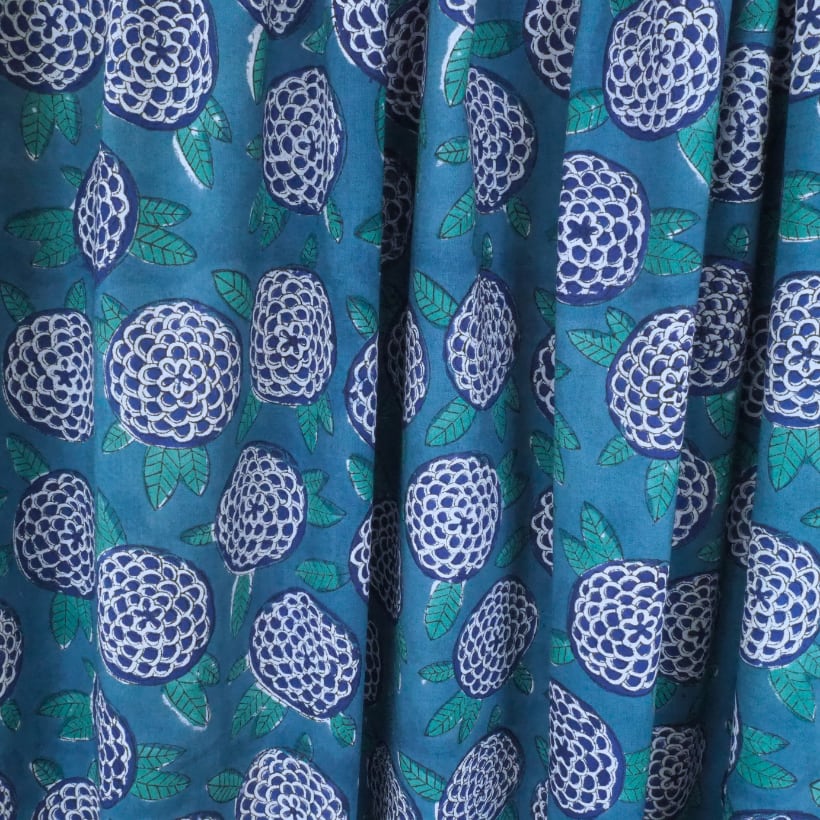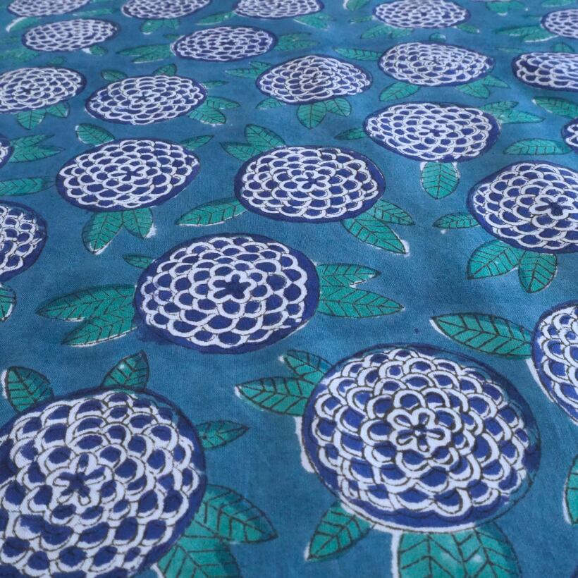 ブロックプリント生地【50cm単位】インド綿 花柄 ブルー×紺色×グリーン #60839-BL1