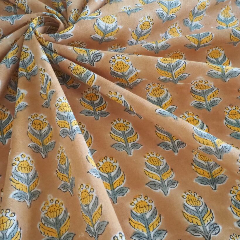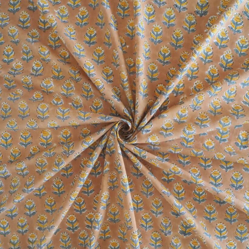 ブロックプリント生地【50cm単位】インド綿 小花柄 イエローベージュ×グレー #61240-YL2