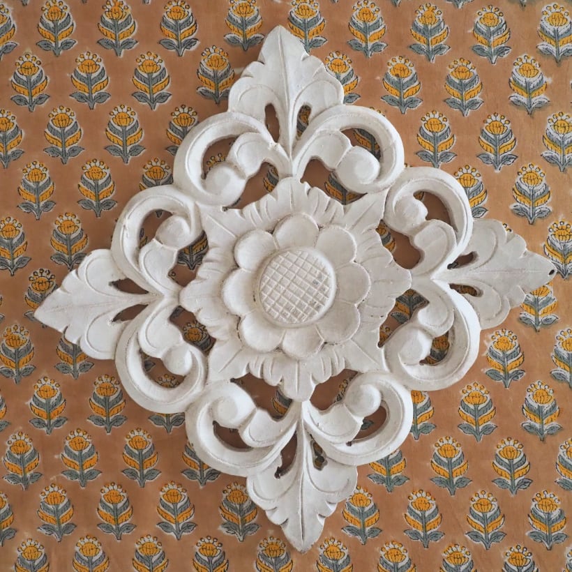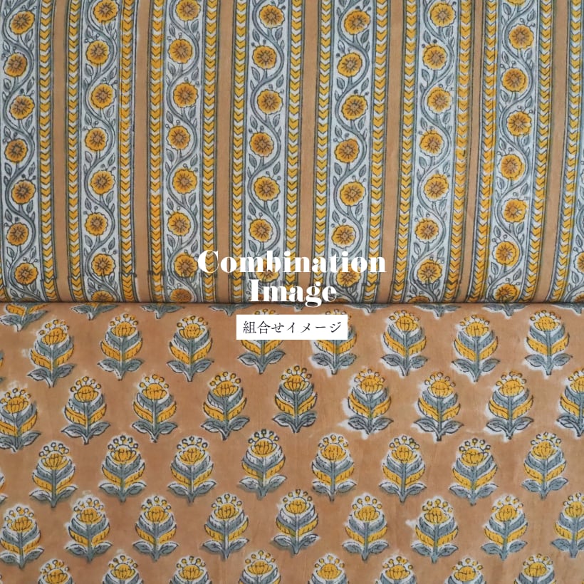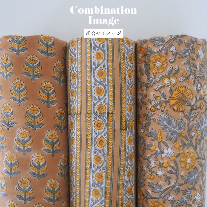 ハンドブロックプリントと呼ばれるインドのジャイプール地方に古くから伝わる伝統的な技法で、木彫りのスタンプで色を何度も重ね、全ての工程がインドの職人さんの手作業によって仕上がるAll Handmadeの生地です。