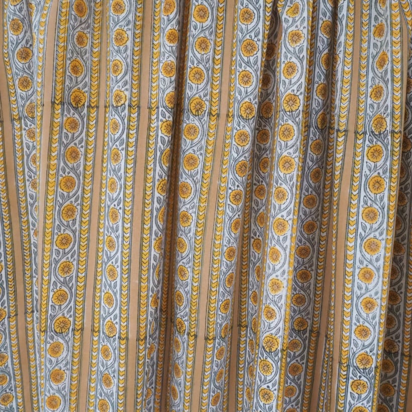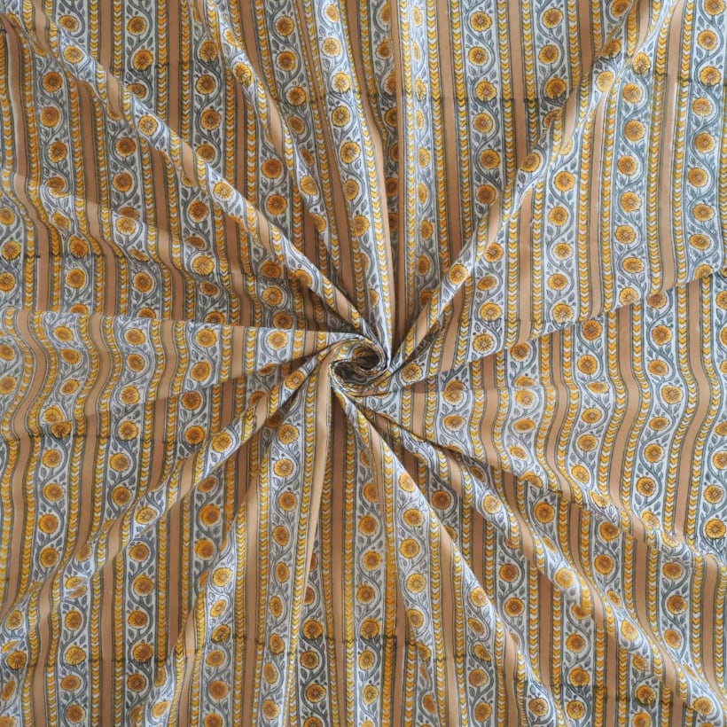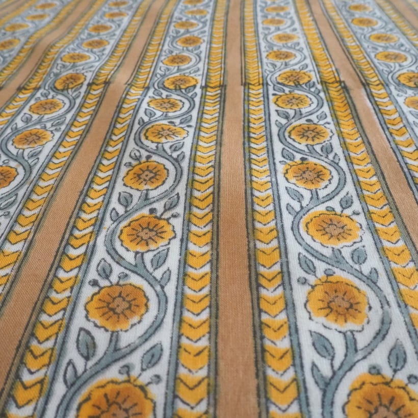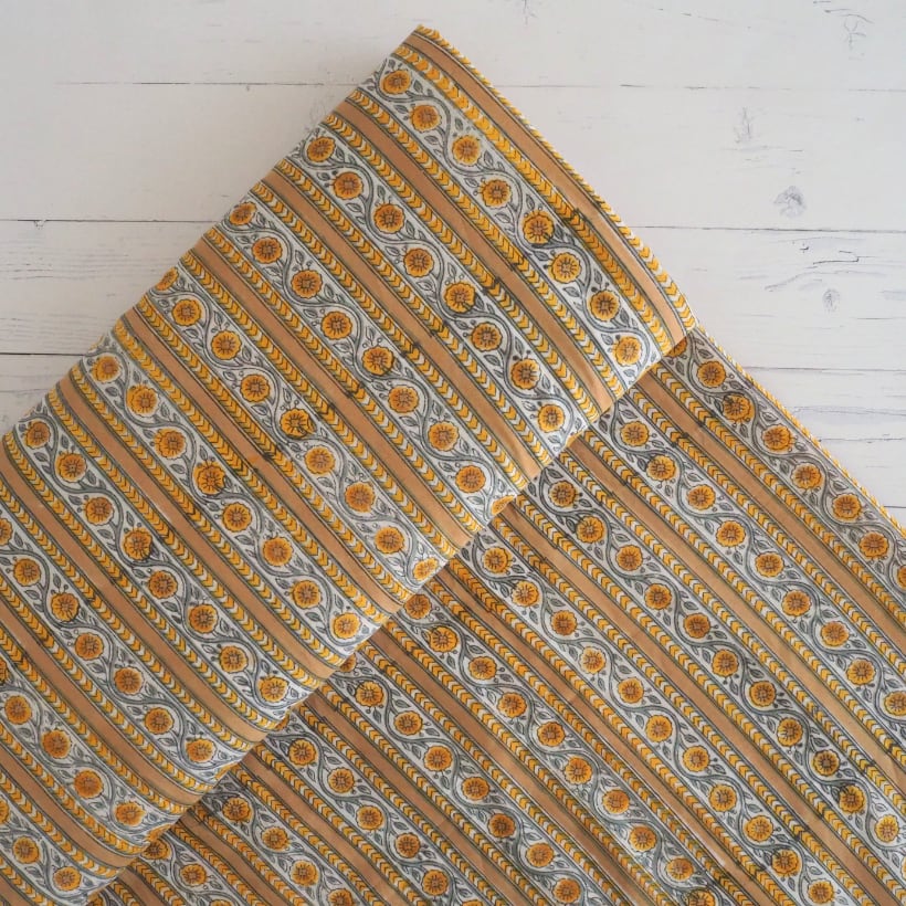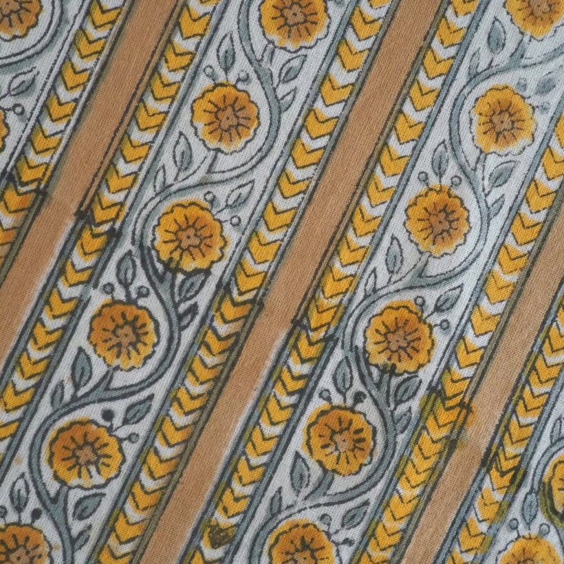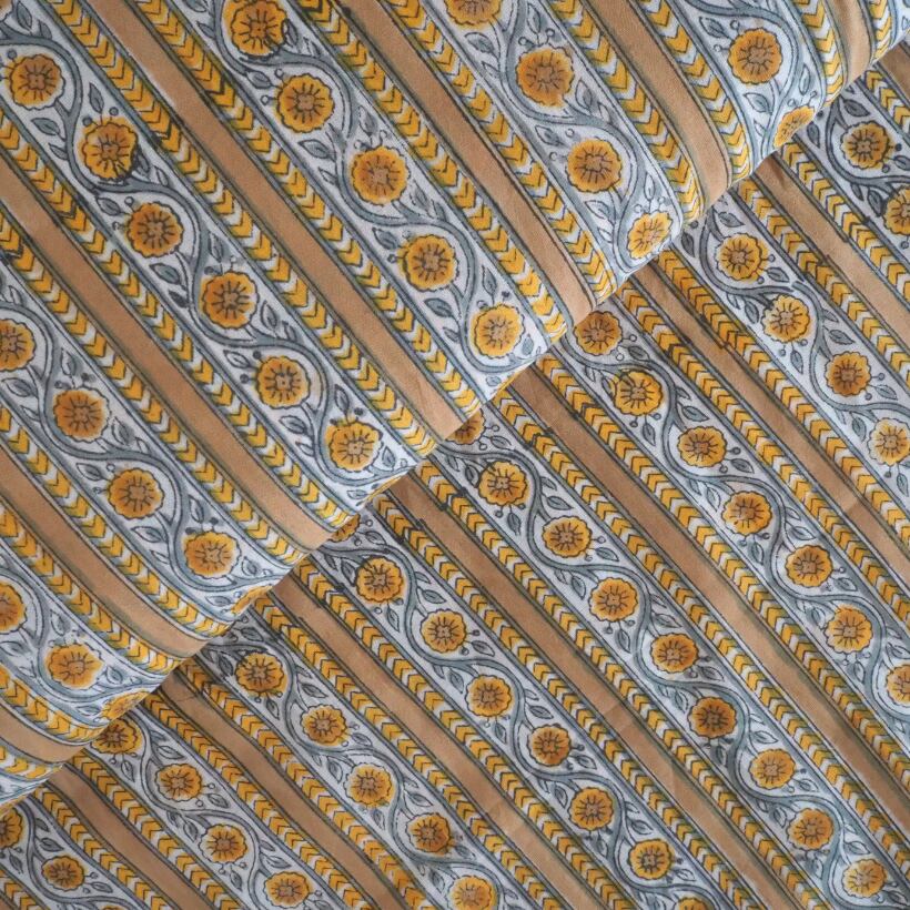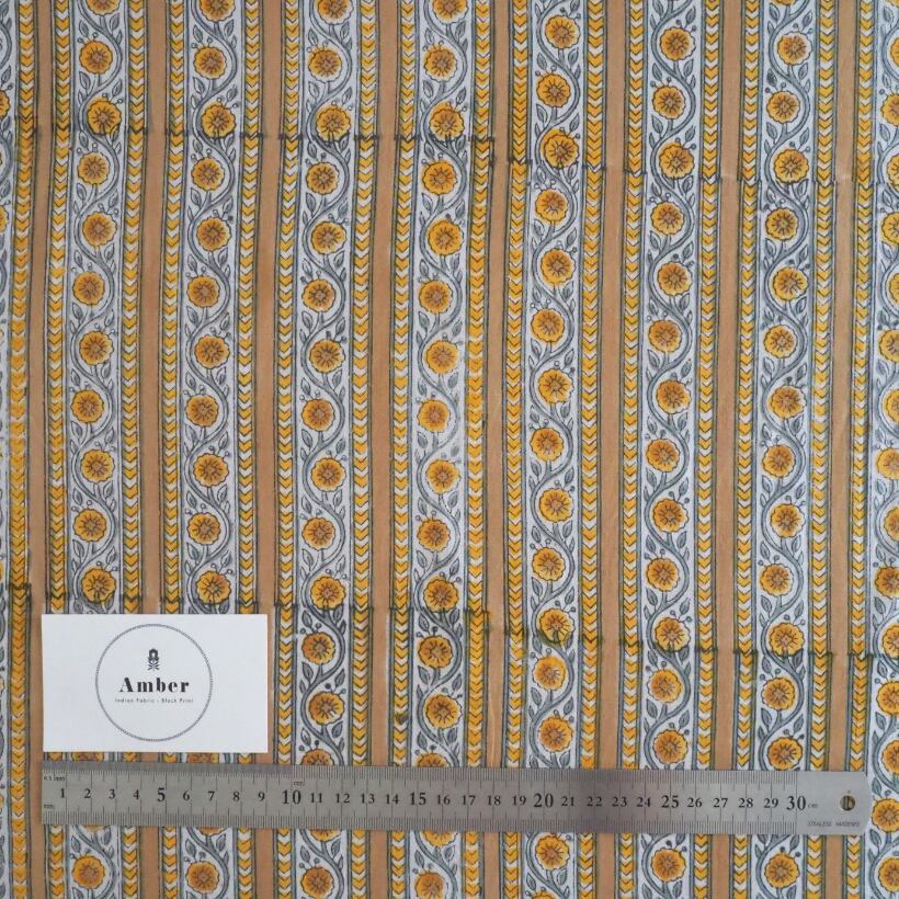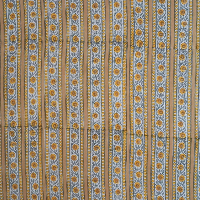 ブロックプリント生地【50cm単位】インド綿 ストライプ柄 イエローベージュ×グレー #61340-YL3