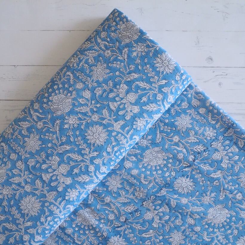 ブロックプリント生地【50cm単位】インド綿 花柄 水色×白 #62010-BL1