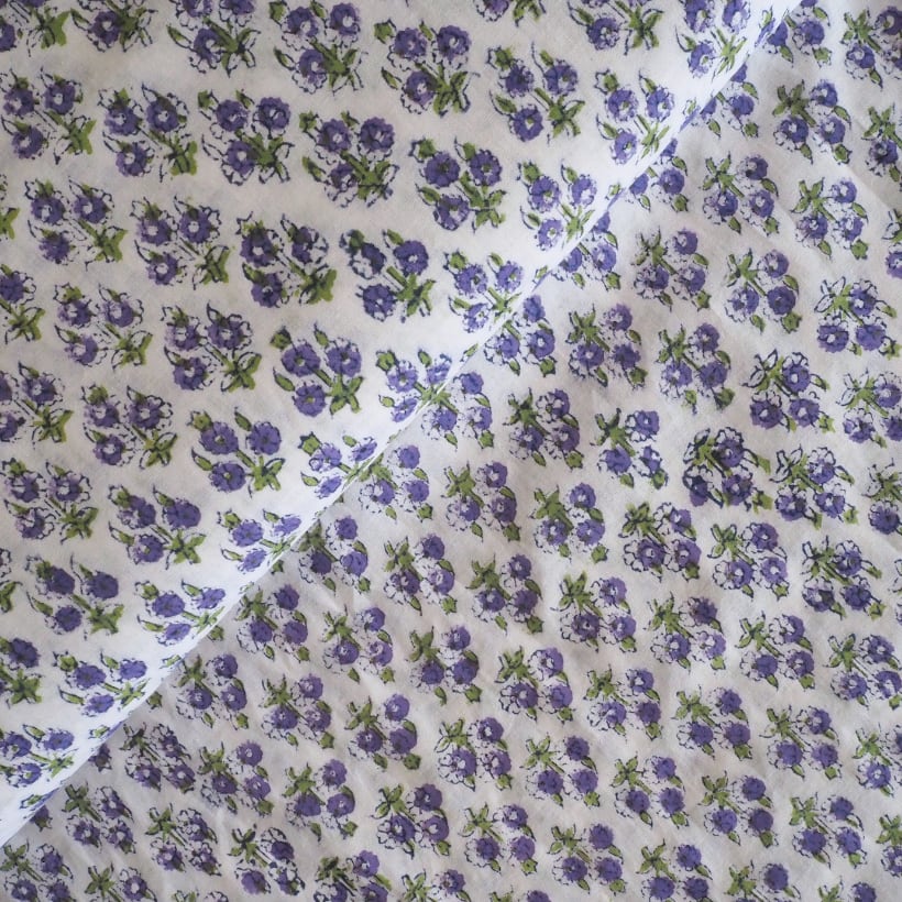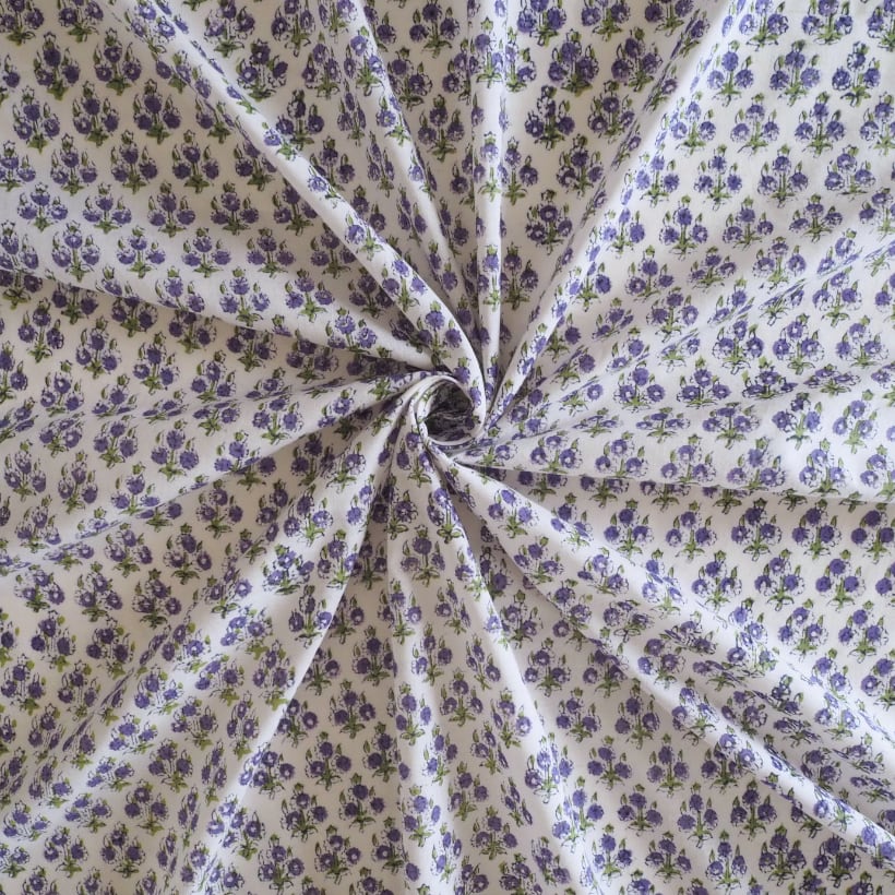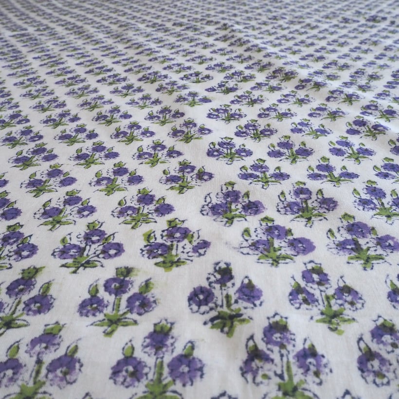 ブロックプリント生地【50cm単位】インド綿 花柄 白×パープル×グリーン #62742-PR1