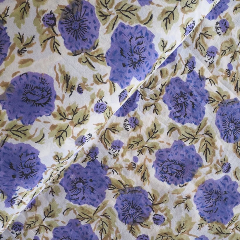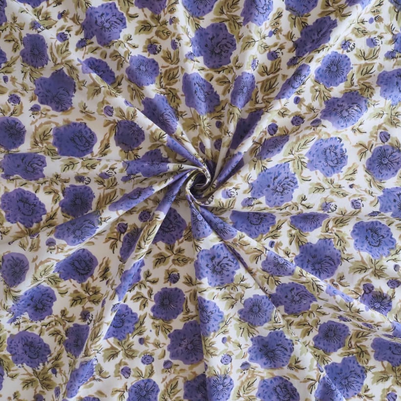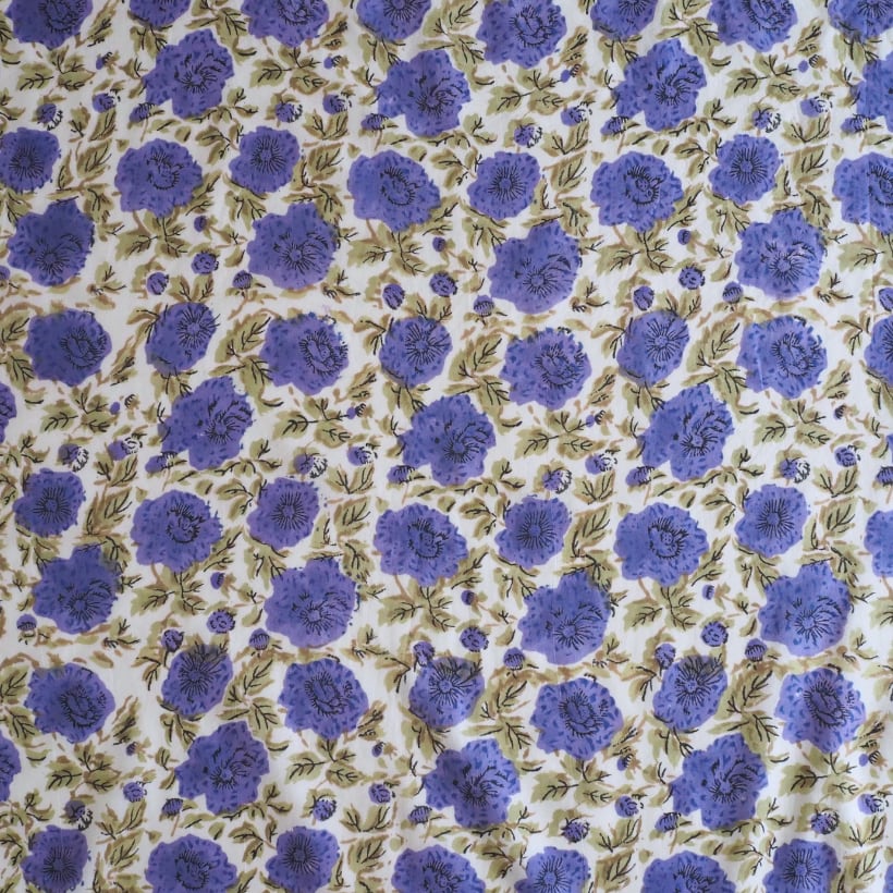 ブロックプリント生地【50cm単位】インド綿 花柄 白×パープル×グリーン #62842-PR2