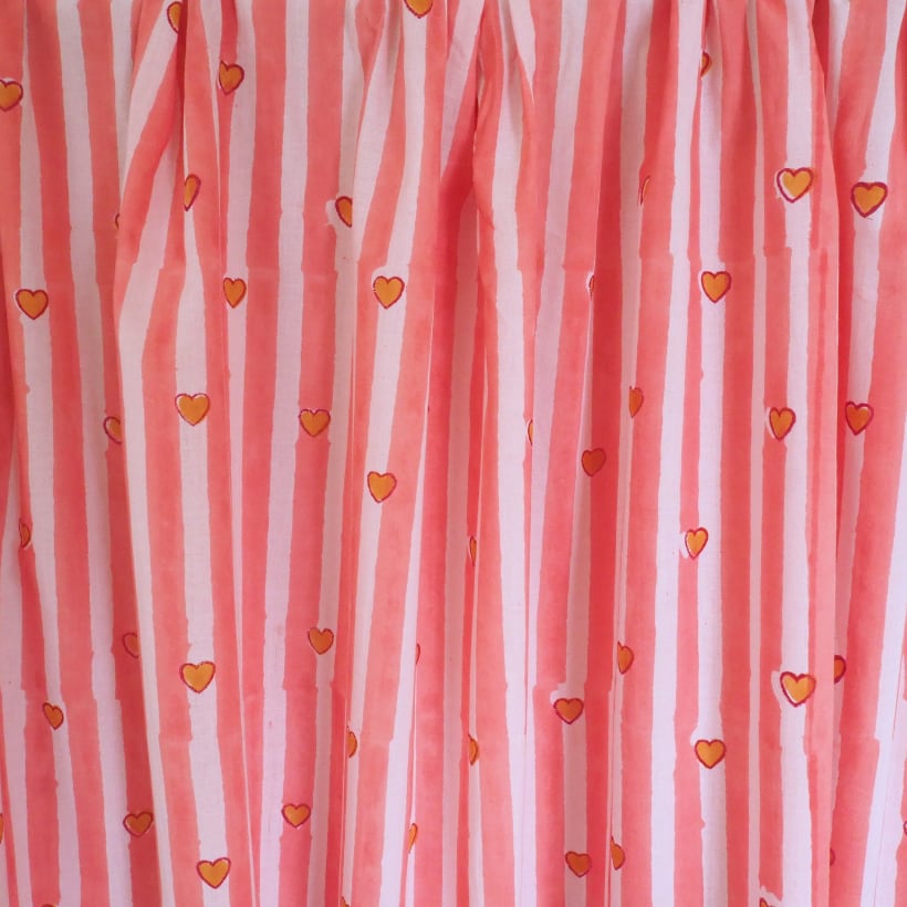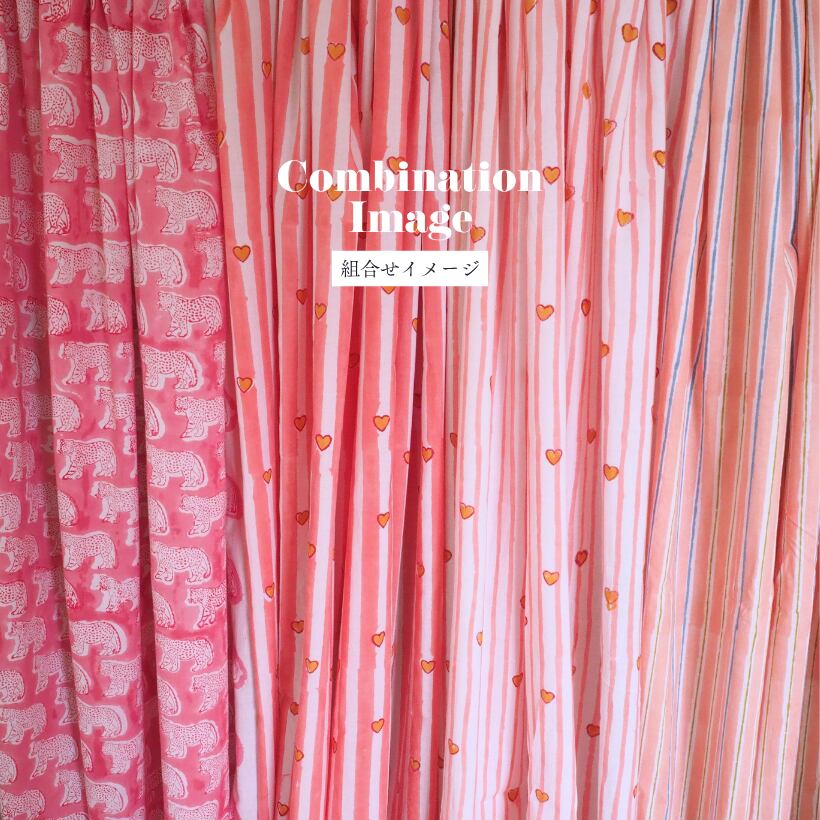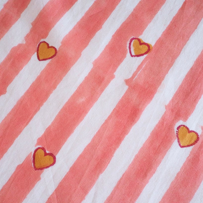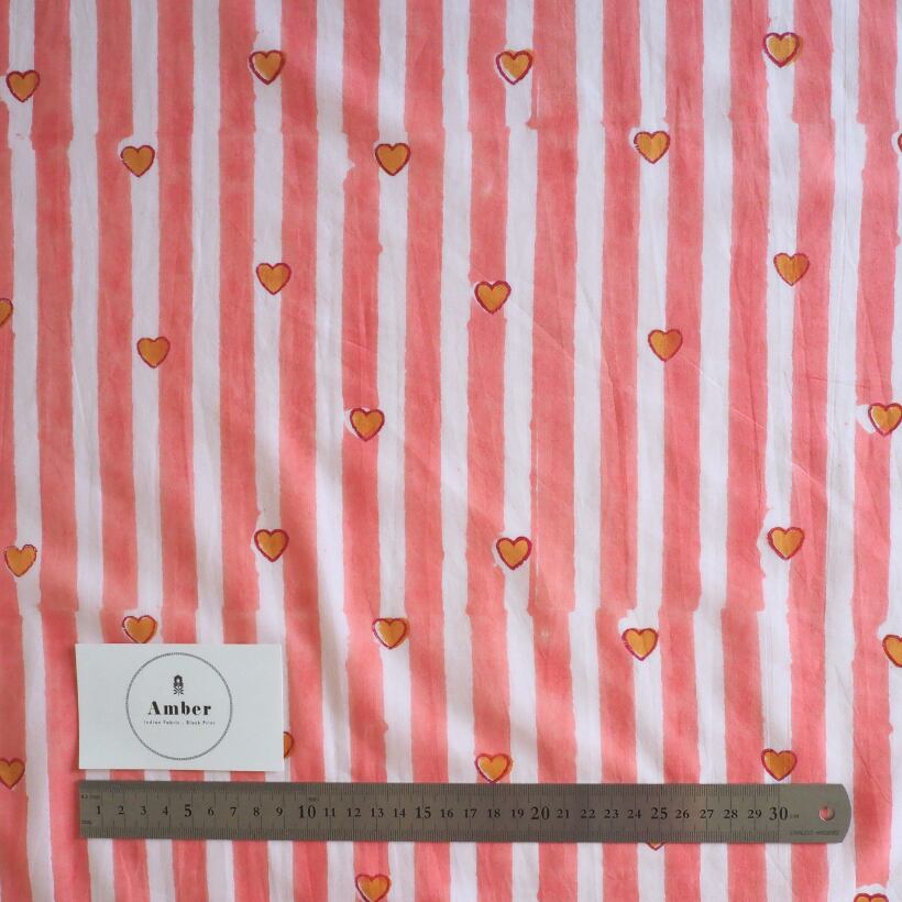 ブロックプリント生地【50cm単位】インド綿 ストライプ・ハート柄A ピンク×白 #63110-PK1