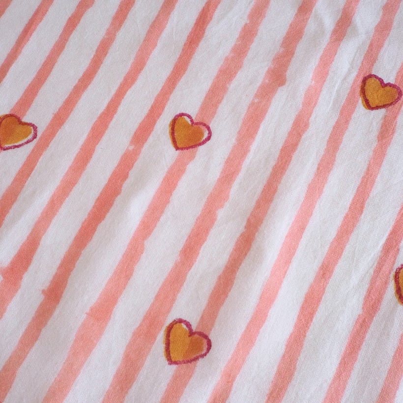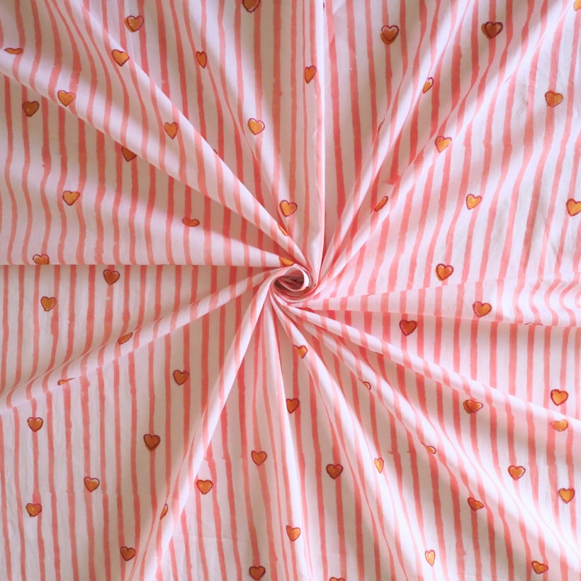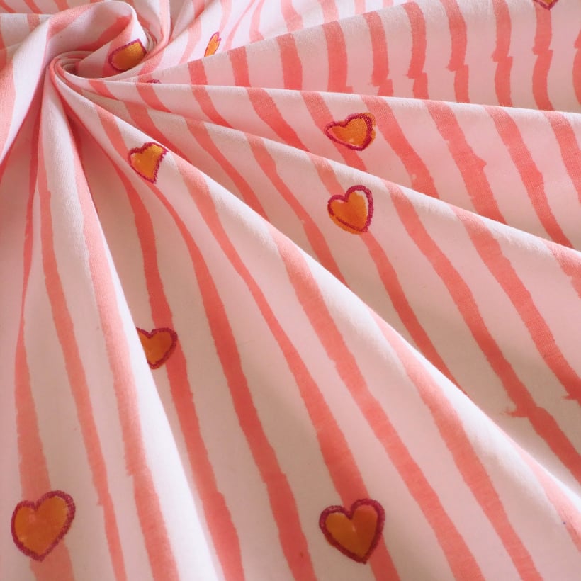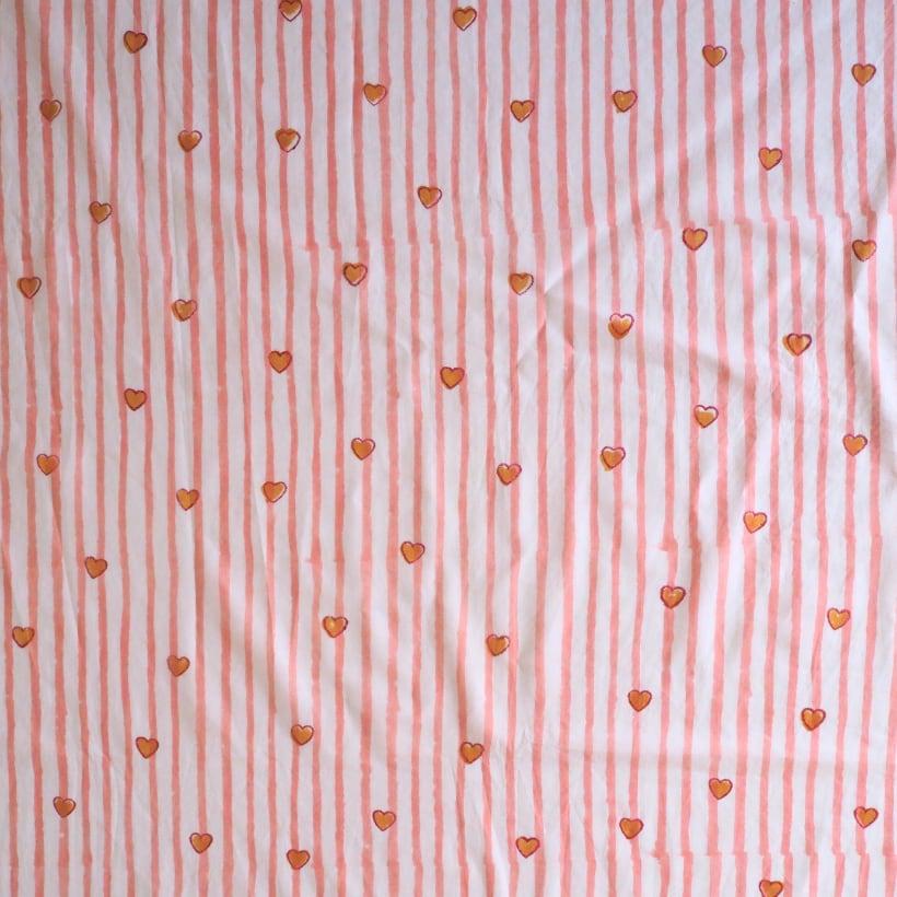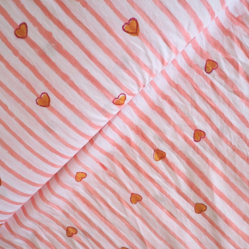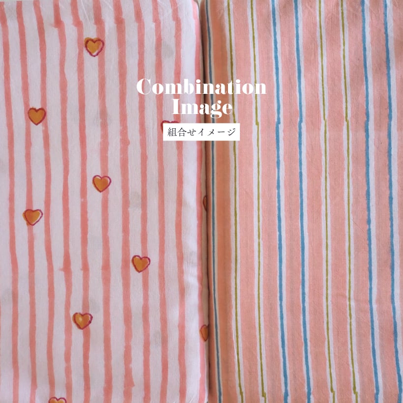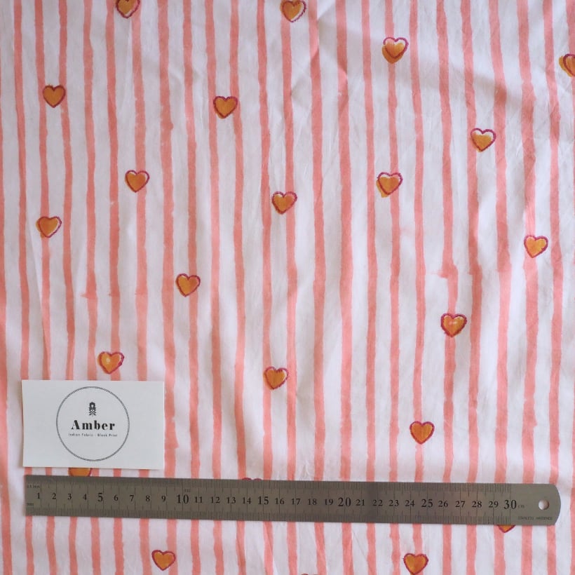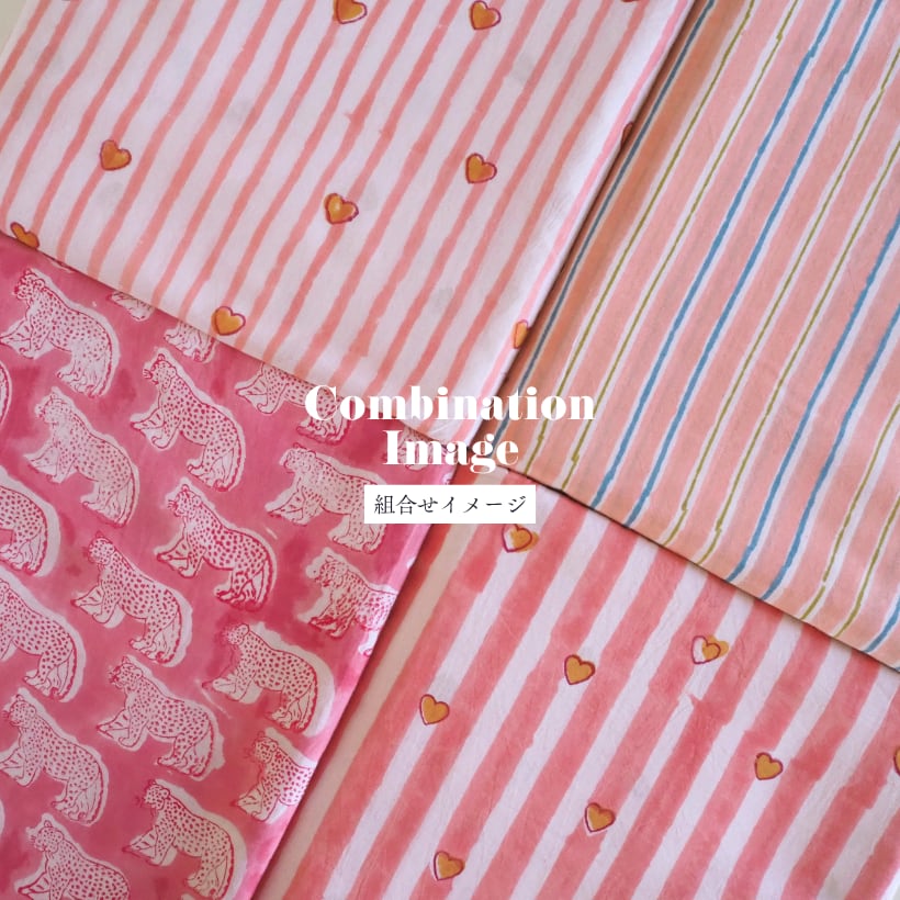 ブロックプリント生地【50cm単位】インド綿 ストライプ・ハート柄B ピンク×白 #63210-PK1