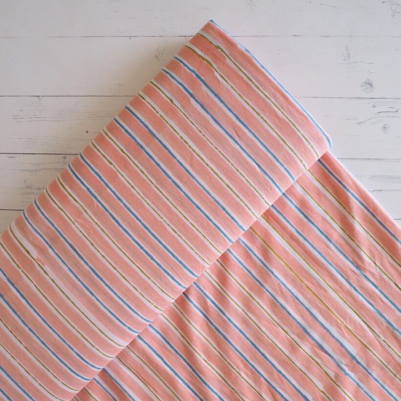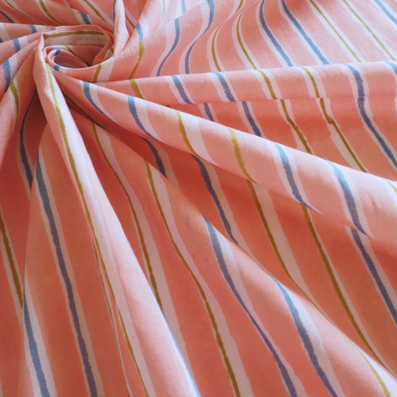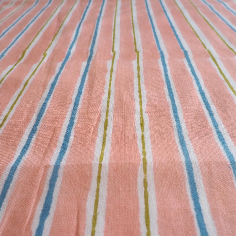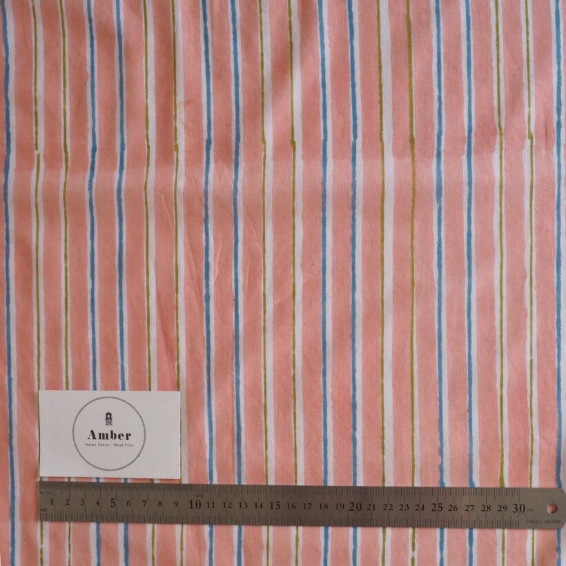 ブロックプリント生地【50cm単位】インド綿 ストライプ柄 ピンク×水色×黄色 #63310-PK1