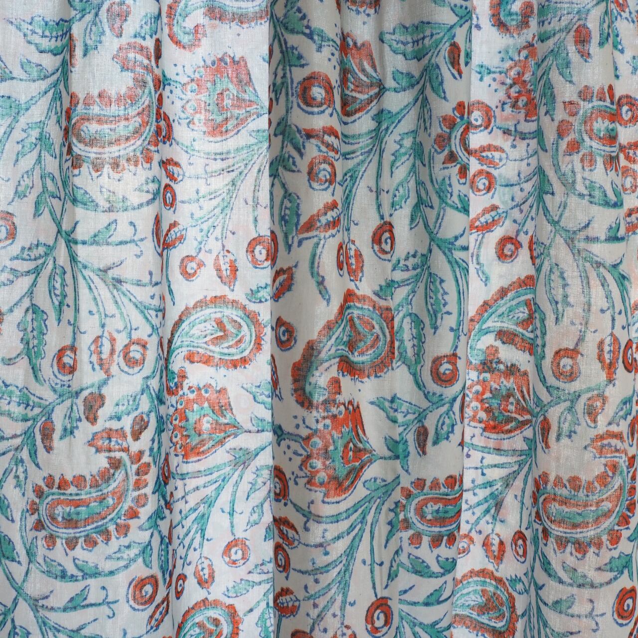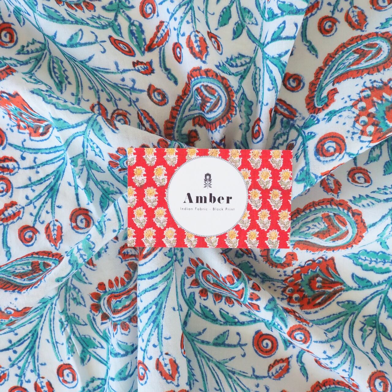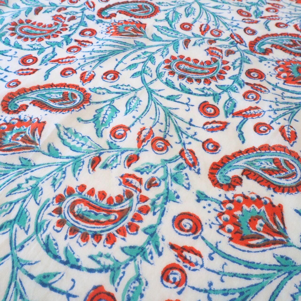 ブロックプリント生地【50cm単位】インド綿 ペイズリー柄 白×緑/オレンジ #10810-WT1