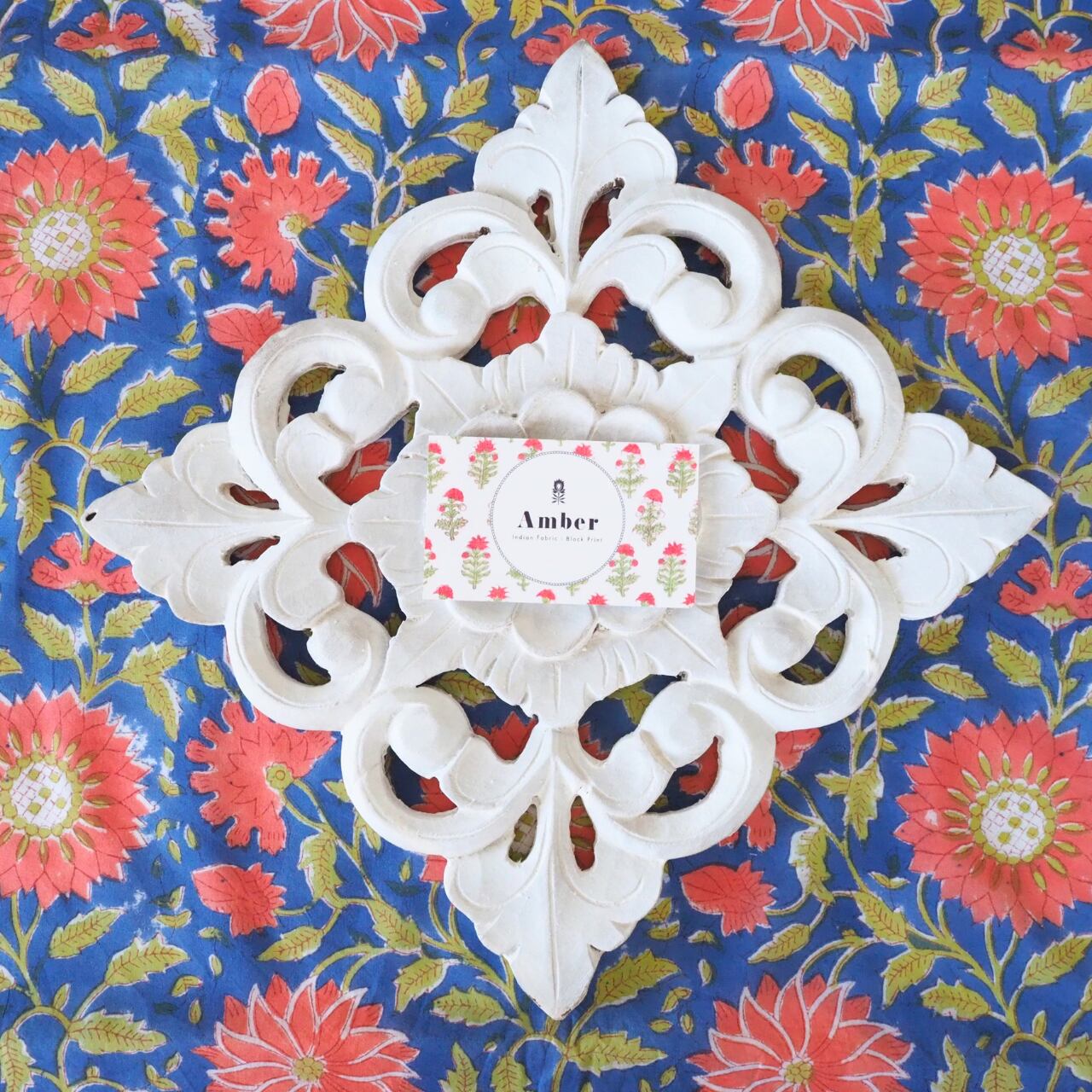 ハンドブロックプリントと呼ばれるインドのジャイプール地方に古くから伝わる伝統的な技法で、木彫りのスタンプで色を何度も重ね、全ての工程がインドの職人さんの手作業によって仕上がるAll Handmadeの生地です。