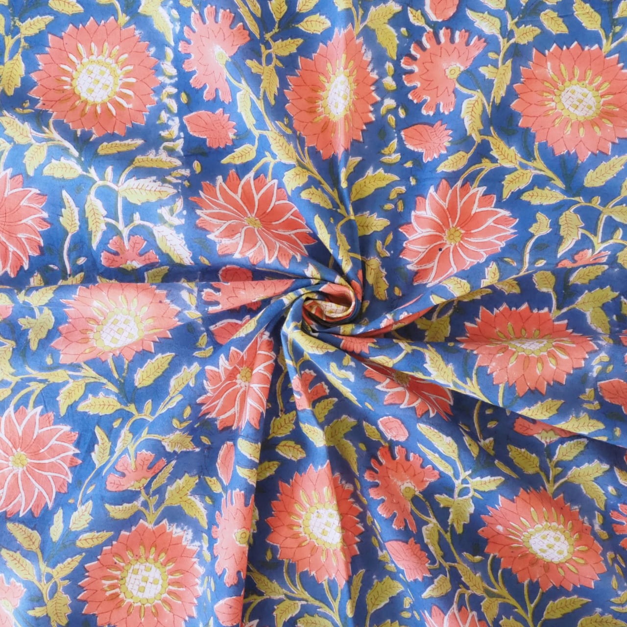 ブロックプリント生地【50cm単位】インド綿 花柄 青×オレンジ #11310-BL1