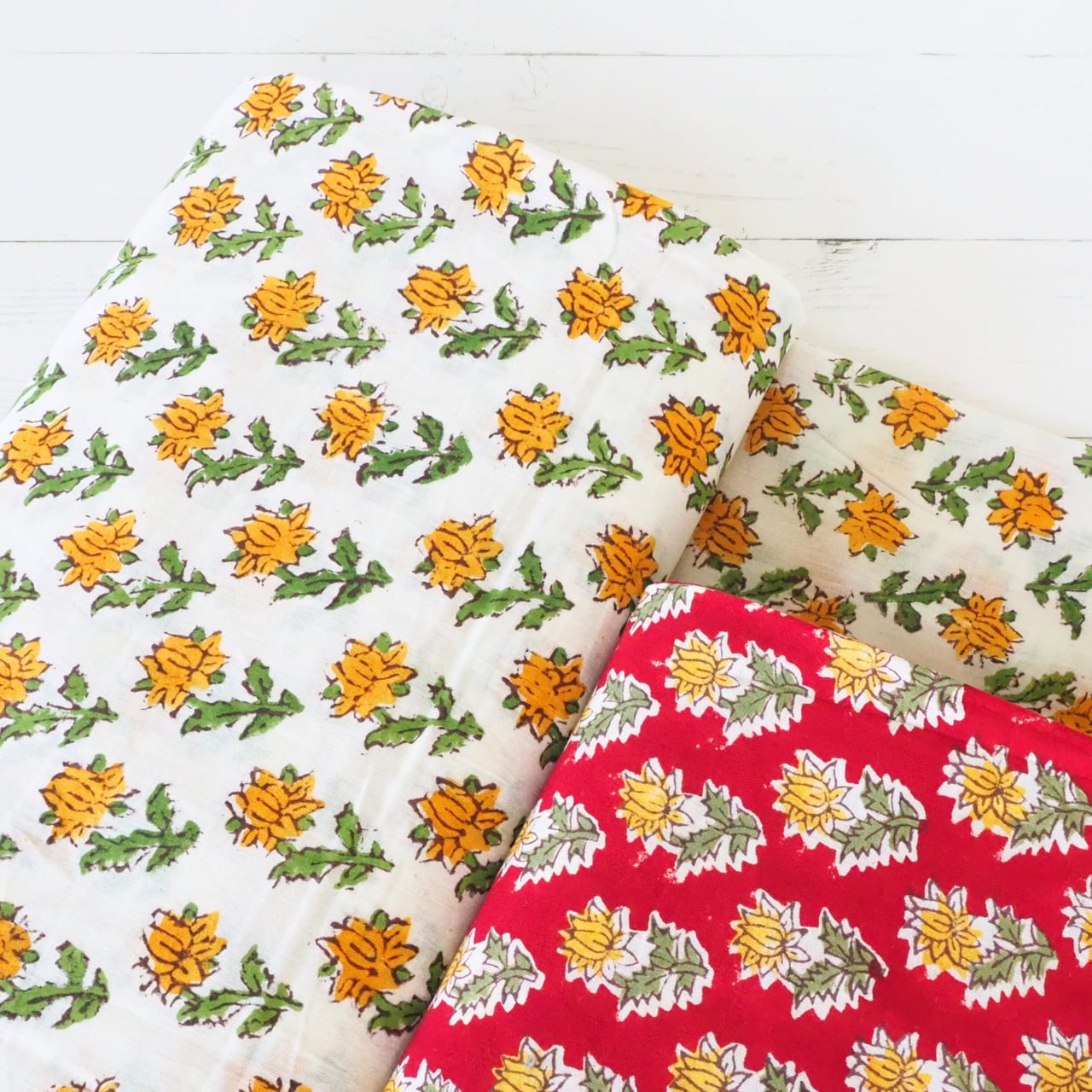 ハンドブロックプリントと呼ばれるインドのジャイプール地方に古くから伝わる伝統的な技法で、木彫りのスタンプで色を何度も重ね、全ての工程がインドの職人さんの手作業によって仕上がるAll Handmadeの生地です。