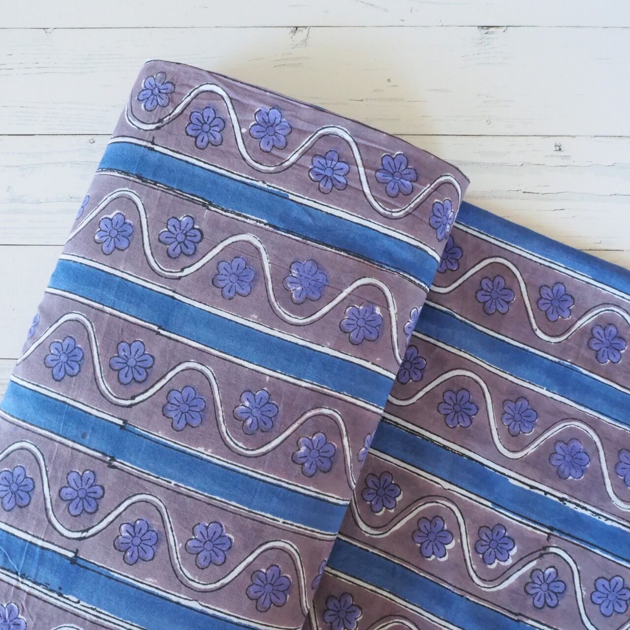 ブロックプリント生地【50cm単位】インド綿 ストライプ柄 パープルグレー×青 #12111-BL3