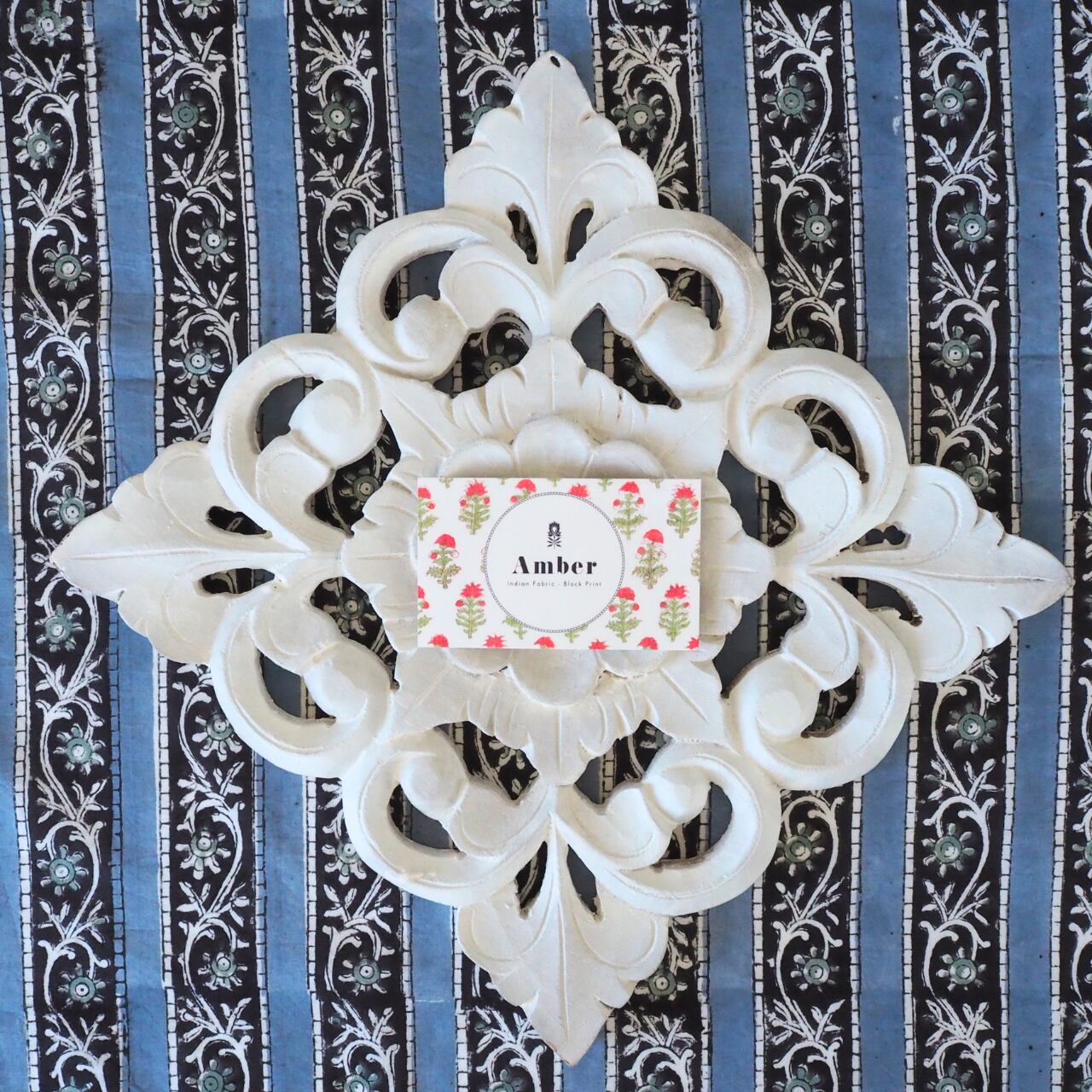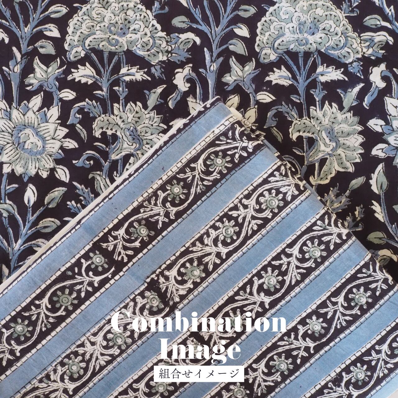 ハンドブロックプリントと呼ばれるインドのジャイプール地方に古くから伝わる伝統的な技法で、木彫りのスタンプで色を何度も重ね、全ての工程がインドの職人さんの手作業によって仕上がるAll Handmadeの生地です。