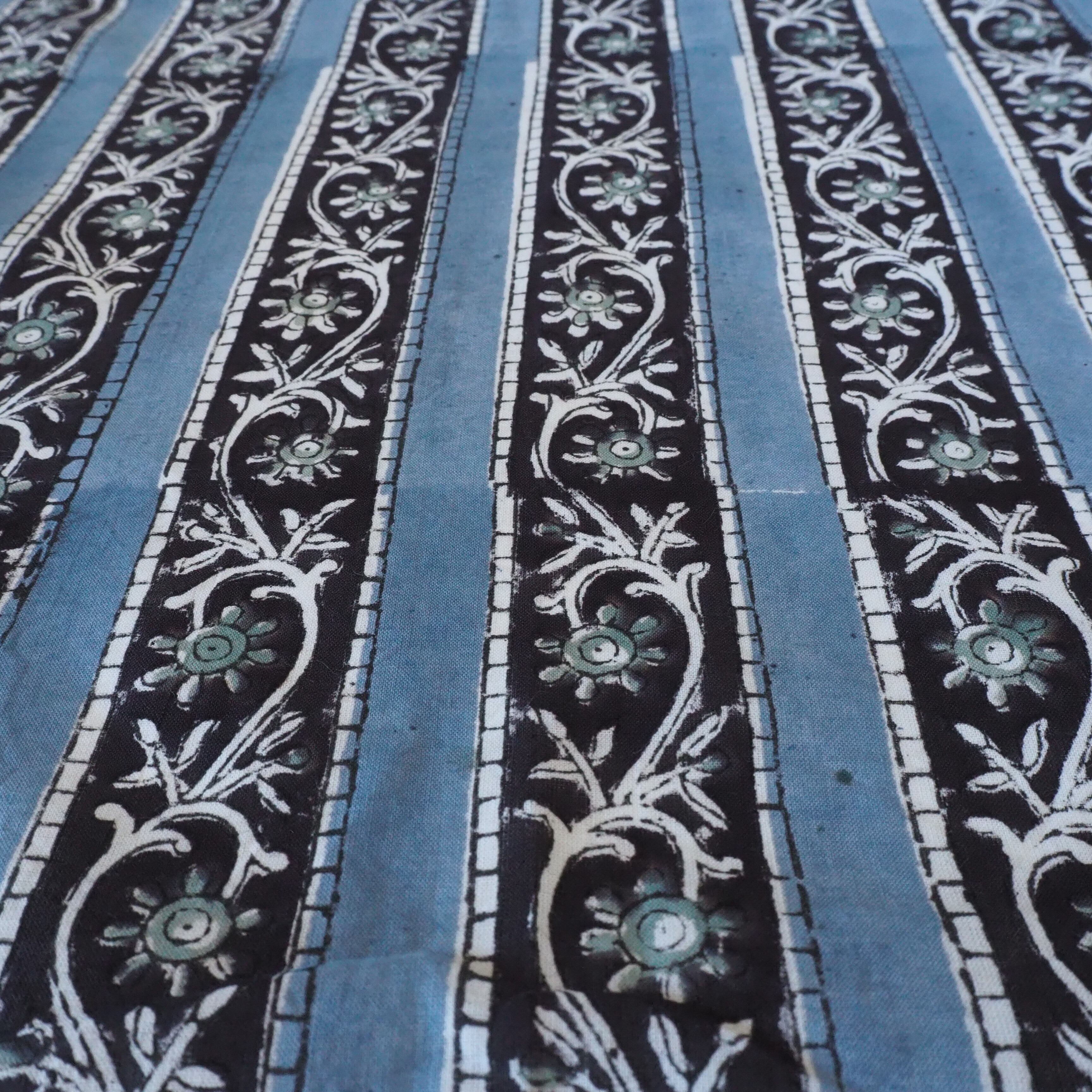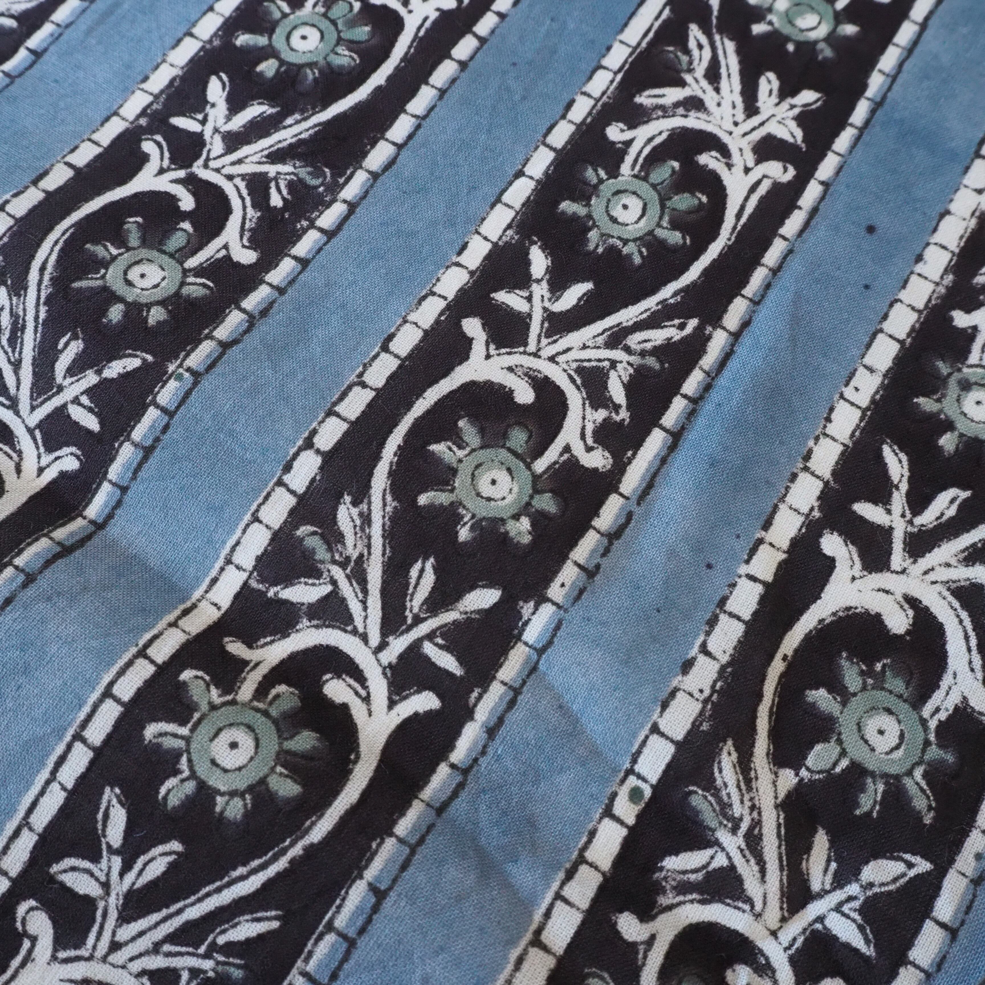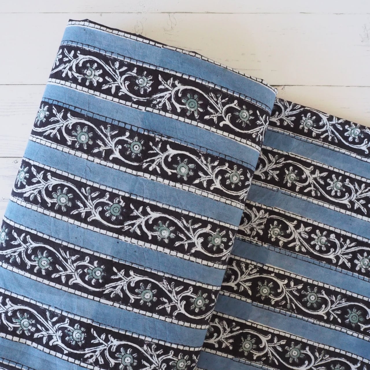 ブロックプリント生地【50cm単位】インド綿 ストライプ柄 黒×水色 #13014-BK1