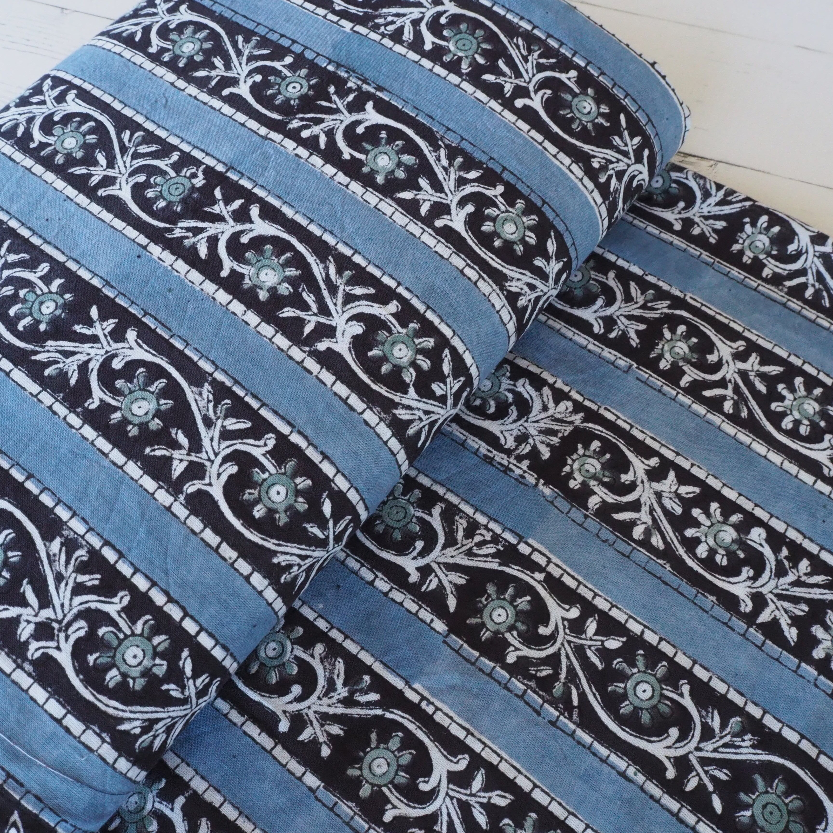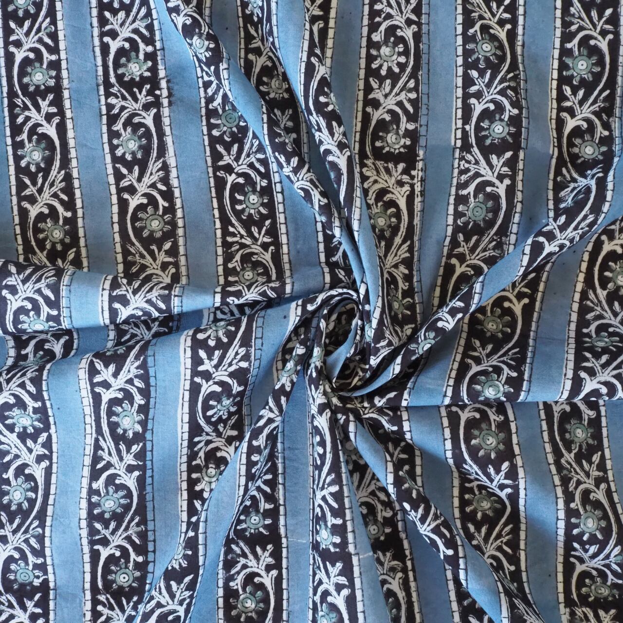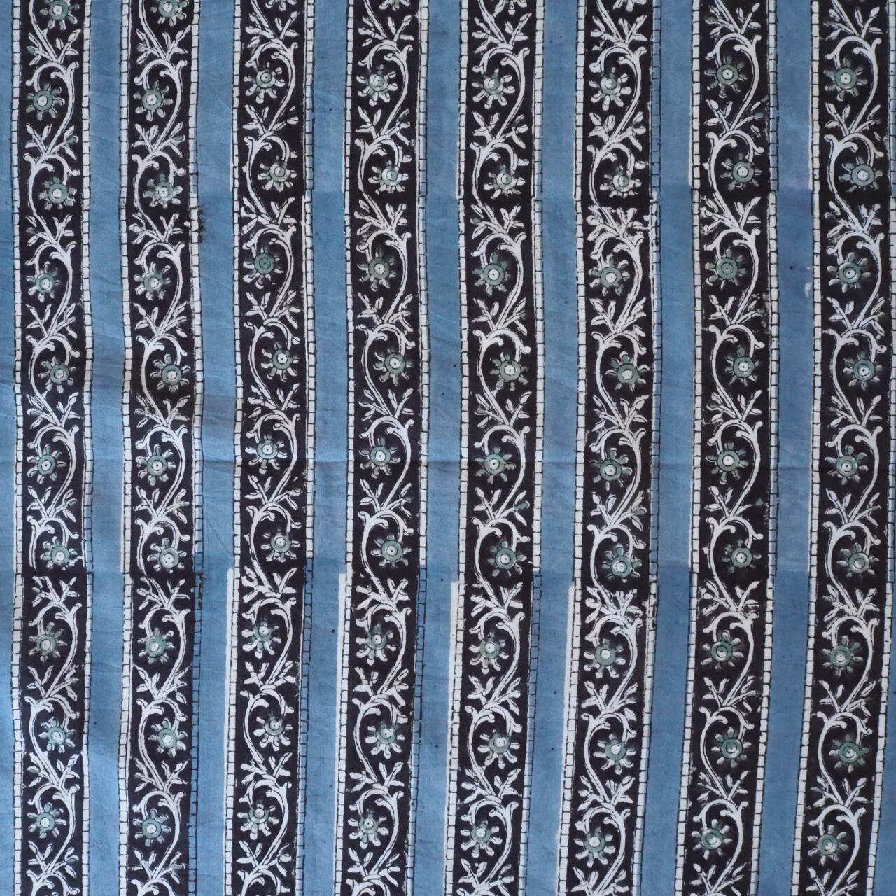 ブロックプリント生地【50cm単位】インド綿 ストライプ柄 黒×水色 #13014-BK1