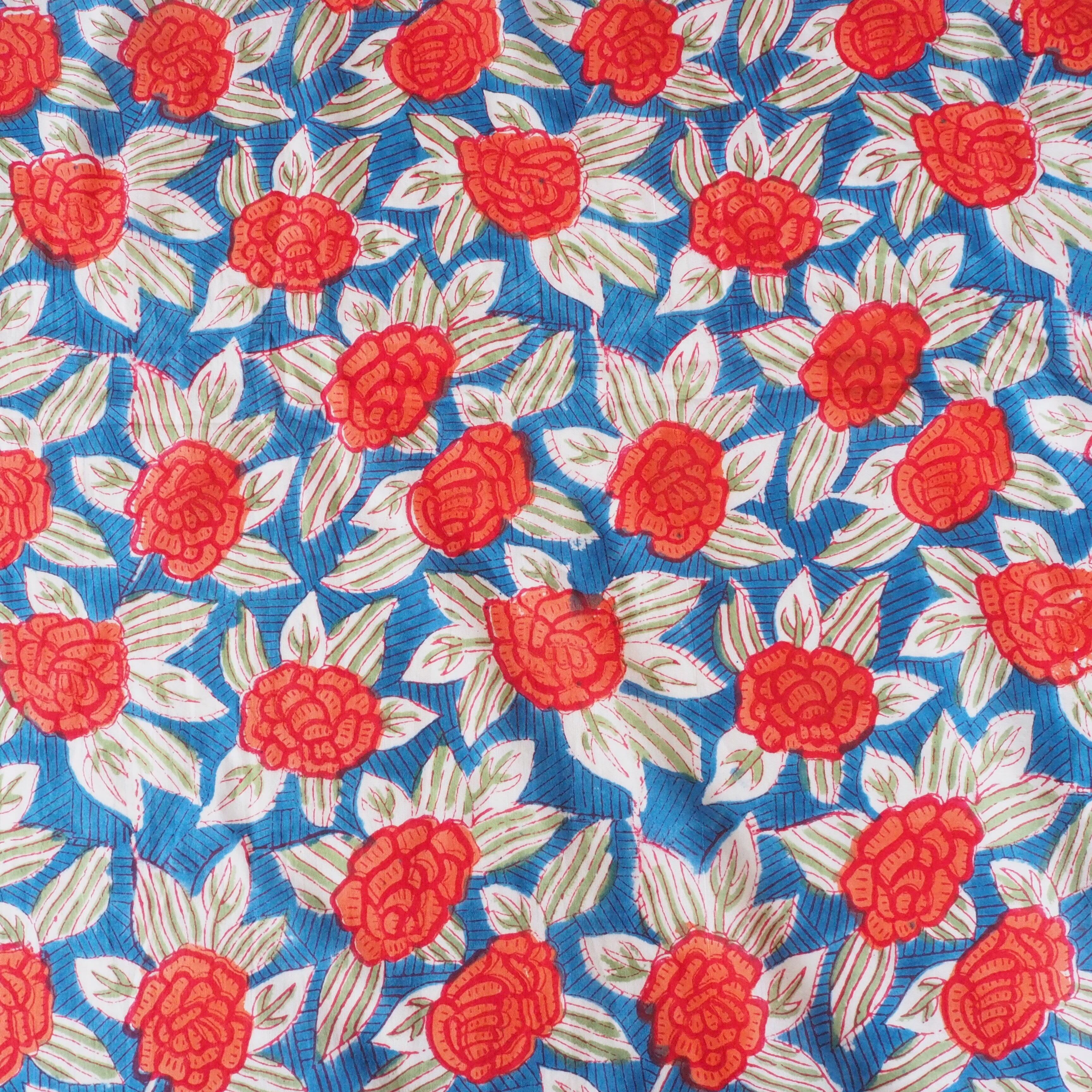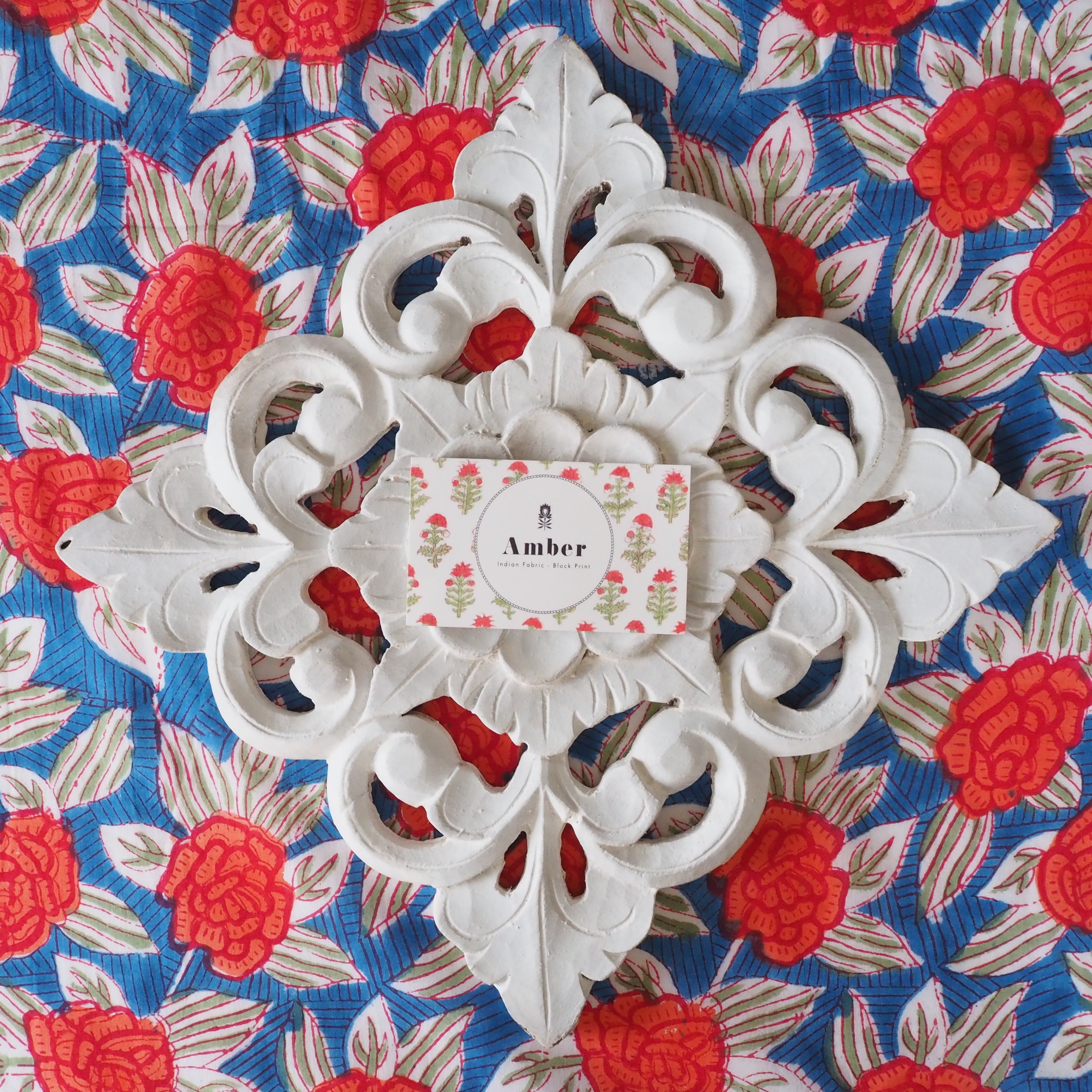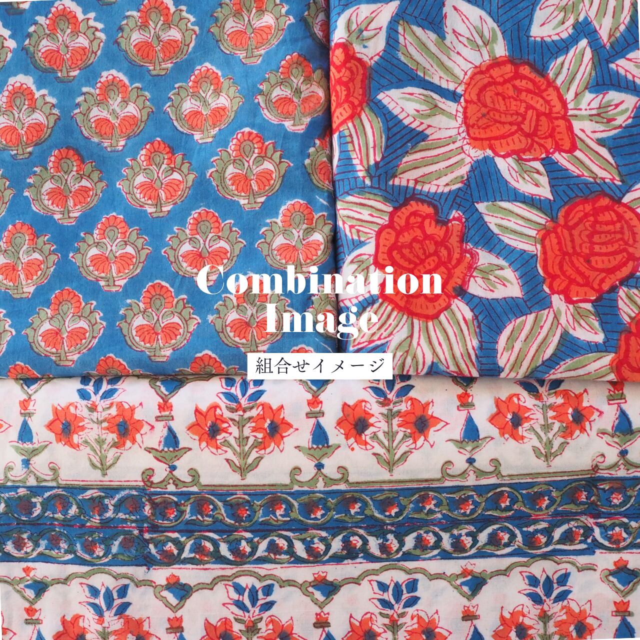 ハンドブロックプリントと呼ばれるインドのジャイプール地方に古くから伝わる伝統的な技法で、木彫りのスタンプで色を何度も重ね、全ての工程がインドの職人さんの手作業によって仕上がるAll Handmadeの生地です。