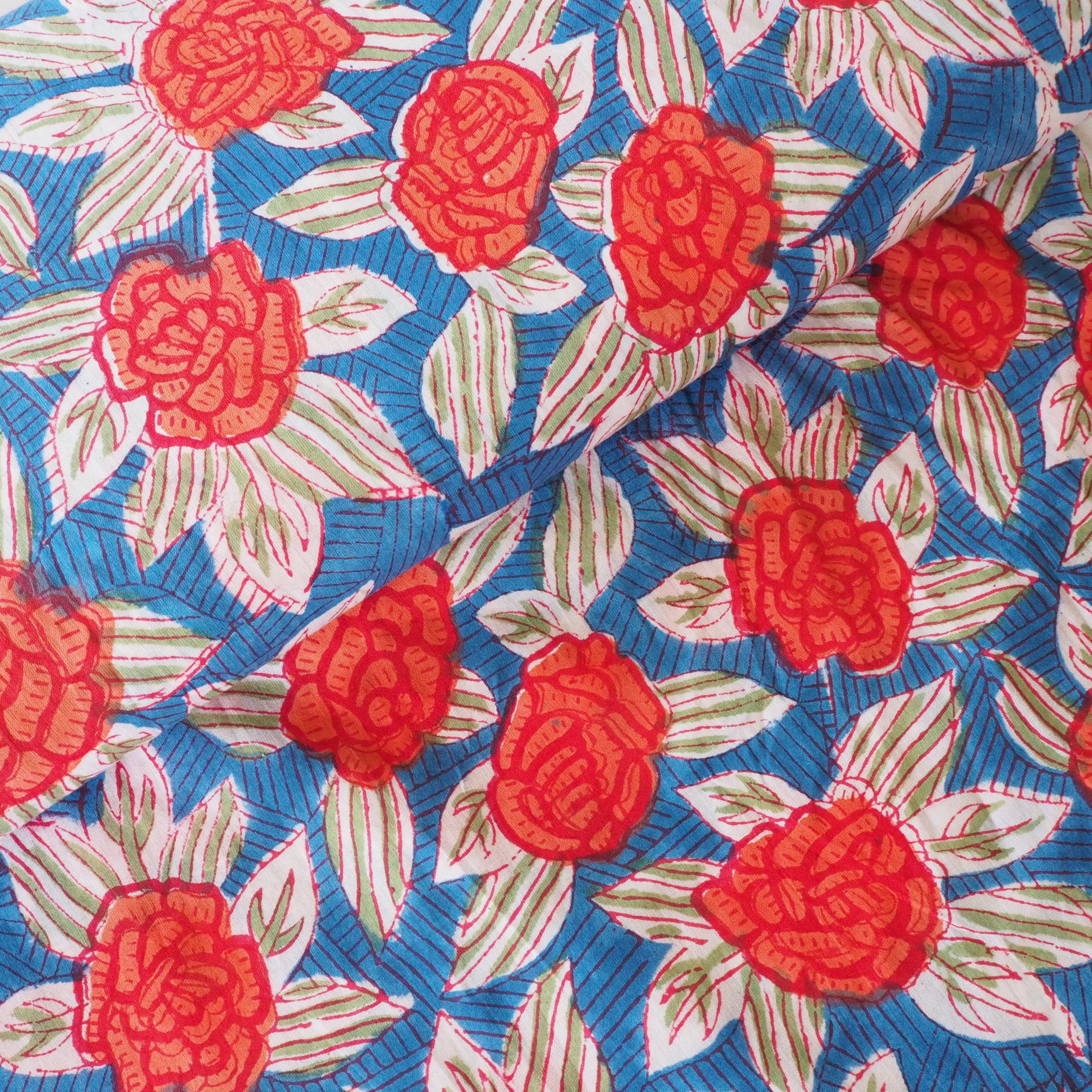 ブロックプリント生地【50cm単位】インド綿 花柄 青×オレンジ #14319-BL1
