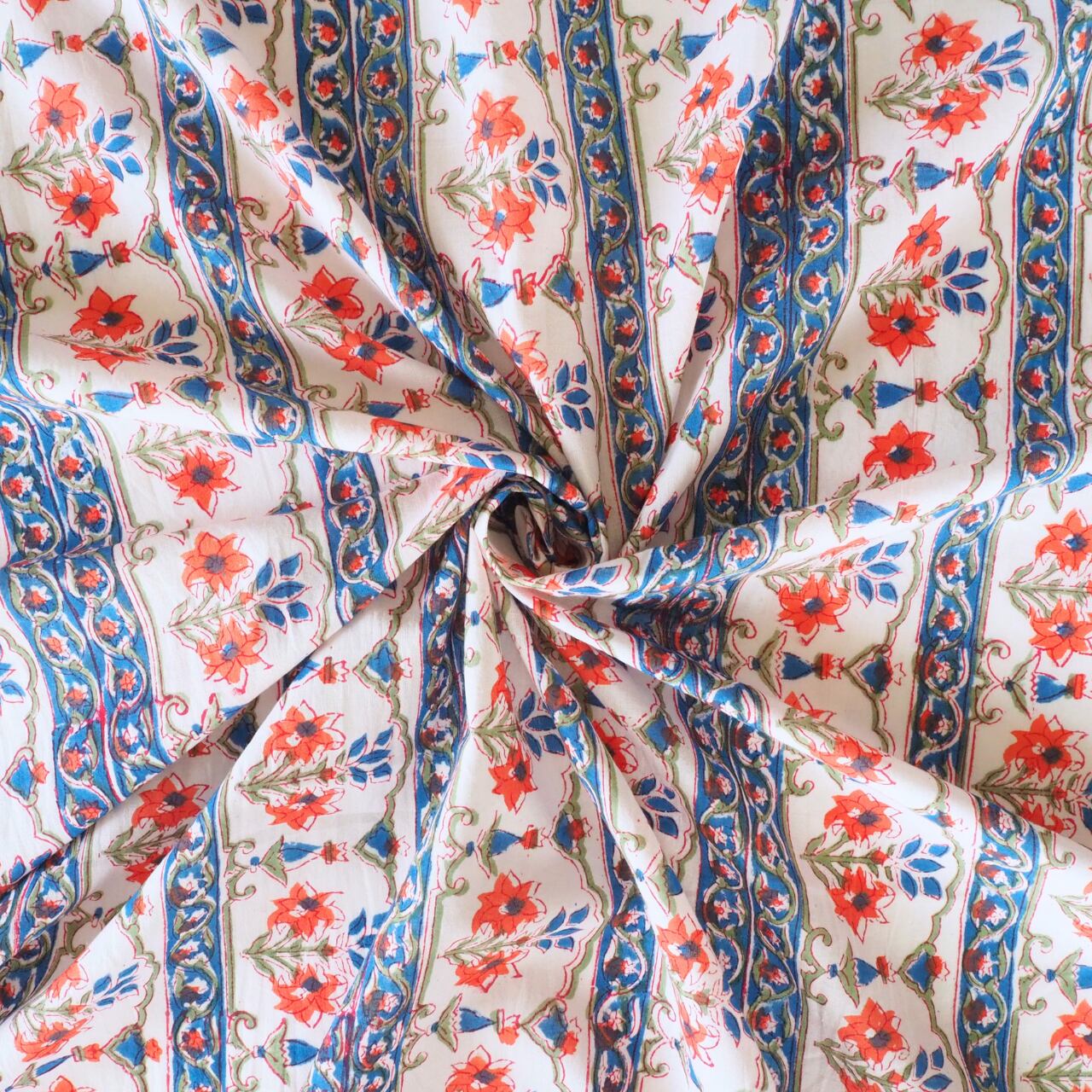 ブロックプリント生地【50cm単位】インド綿 ストライプ柄 白×青×オレンジ #14519-BL3