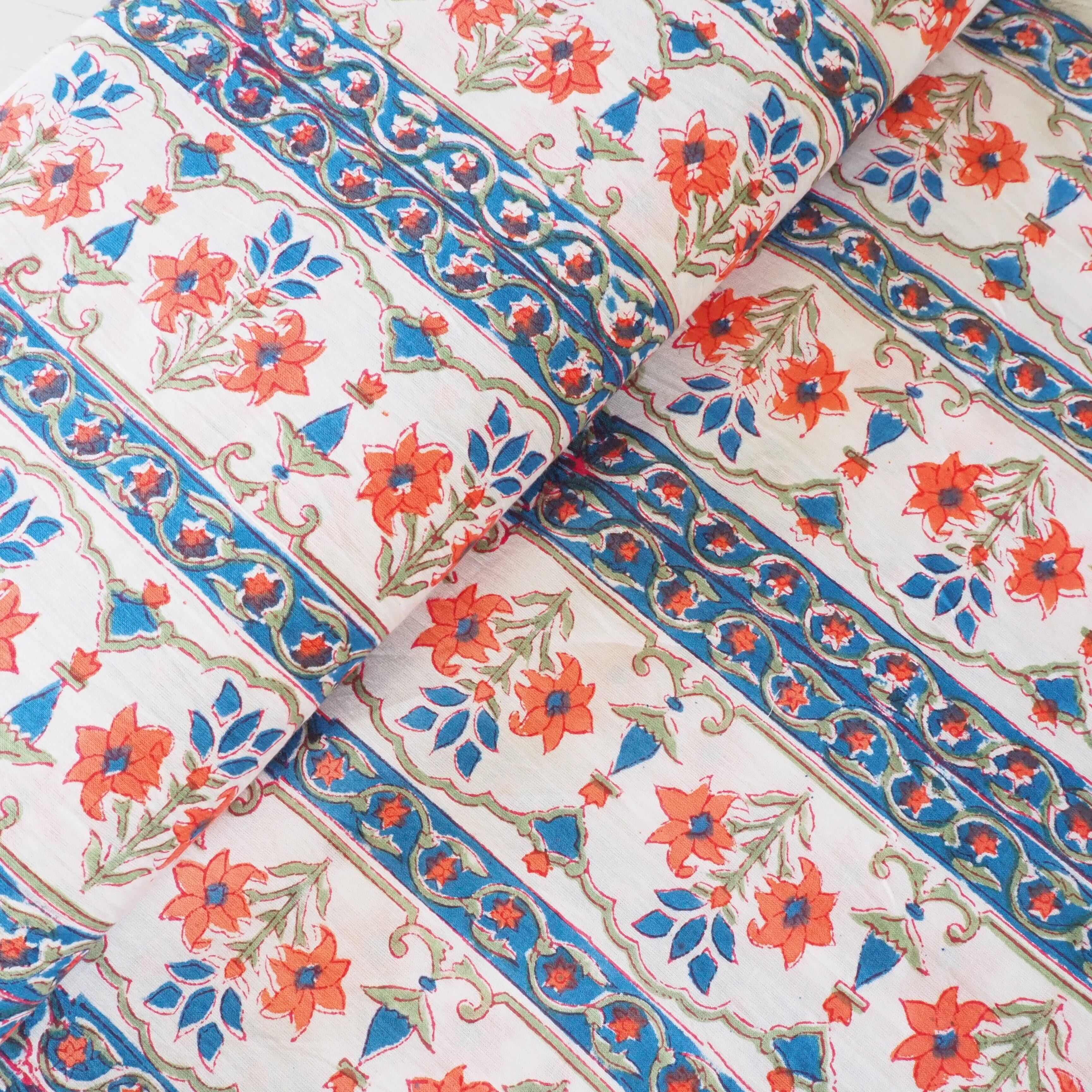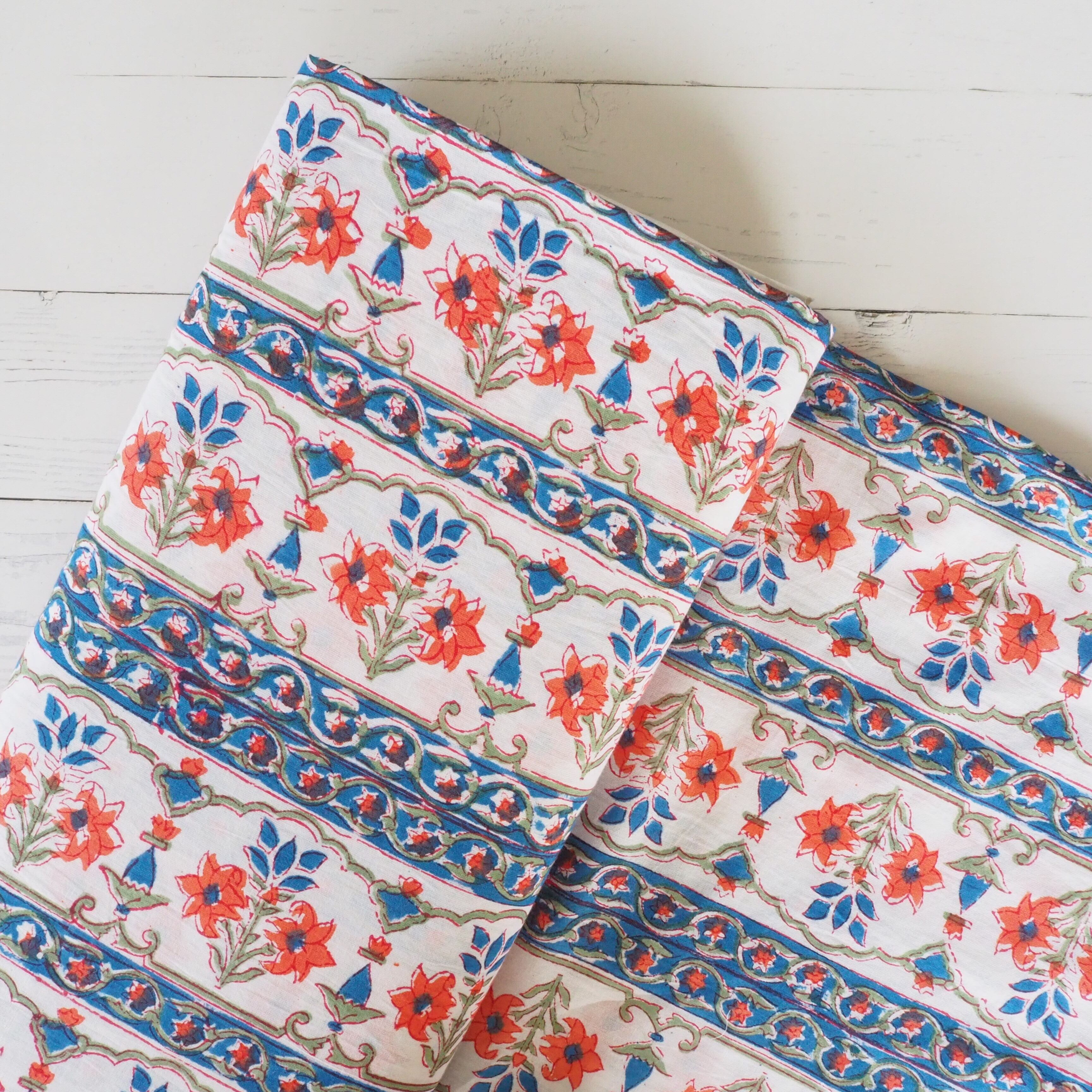 ハンドブロックプリントと呼ばれるインドのジャイプール地方に古くから伝わる伝統的な技法で、木彫りのスタンプで色を何度も重ね、全ての工程がインドの職人さんの手作業によって仕上がるAll Handmadeの生地です。