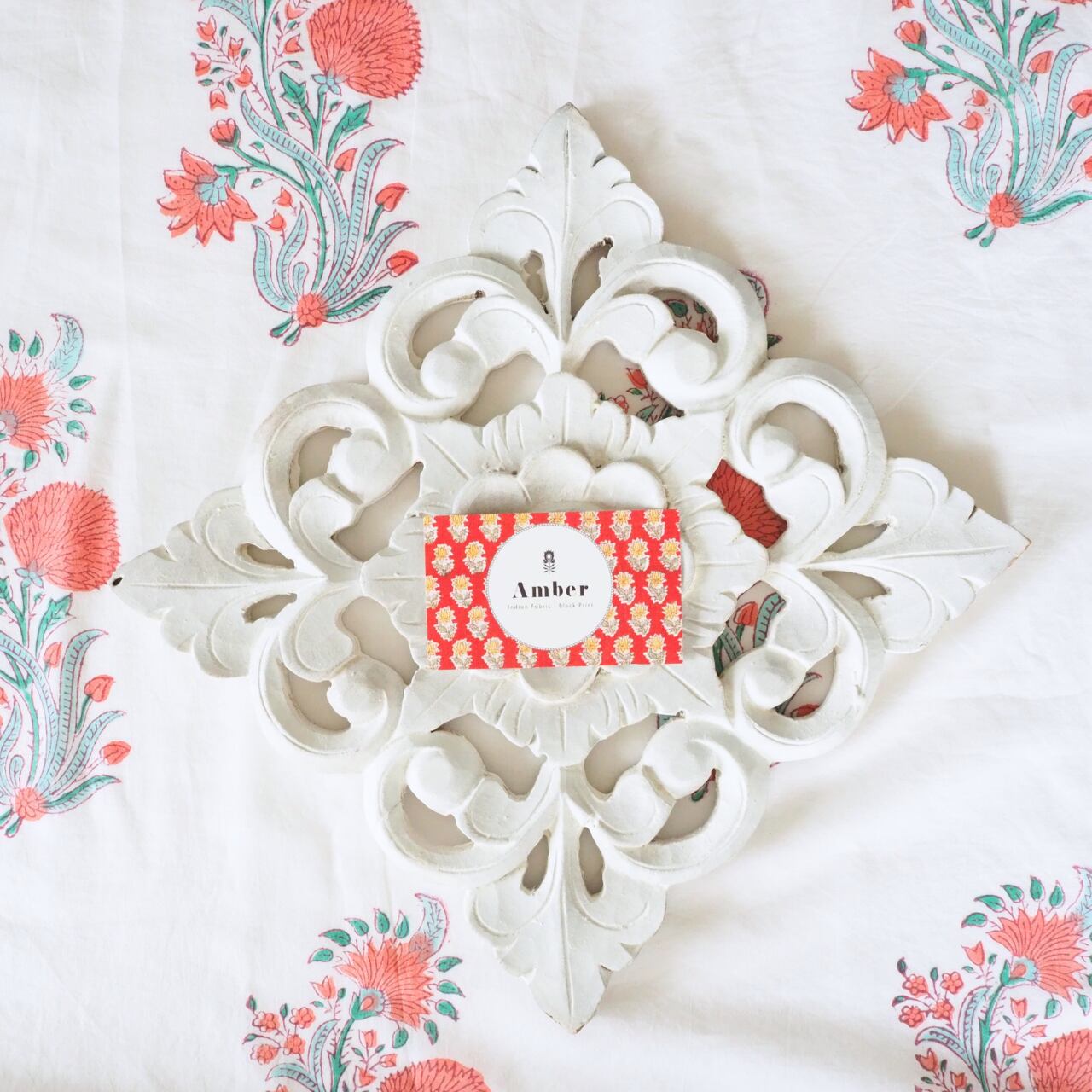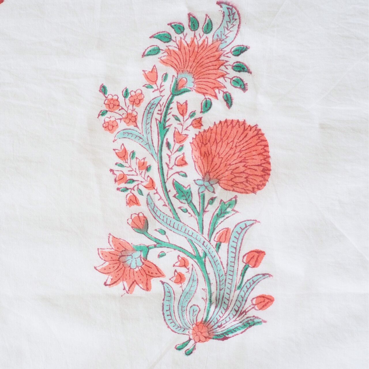 ハンドブロックプリントと呼ばれるインドのジャイプール地方に古くから伝わる伝統的な技法で、木彫りのスタンプで色を何度も重ね、全ての工程がインドの職人さんの手作業によって仕上がるAll Handmadeの生地です。