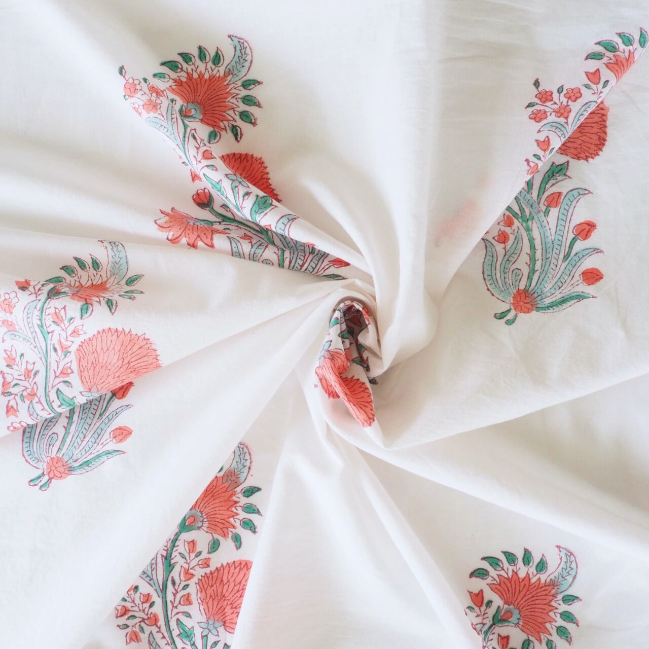 ブロックプリント生地【50cm単位】インド綿 花柄 白×ピンク×エメラルドグリーン #14118-WT1