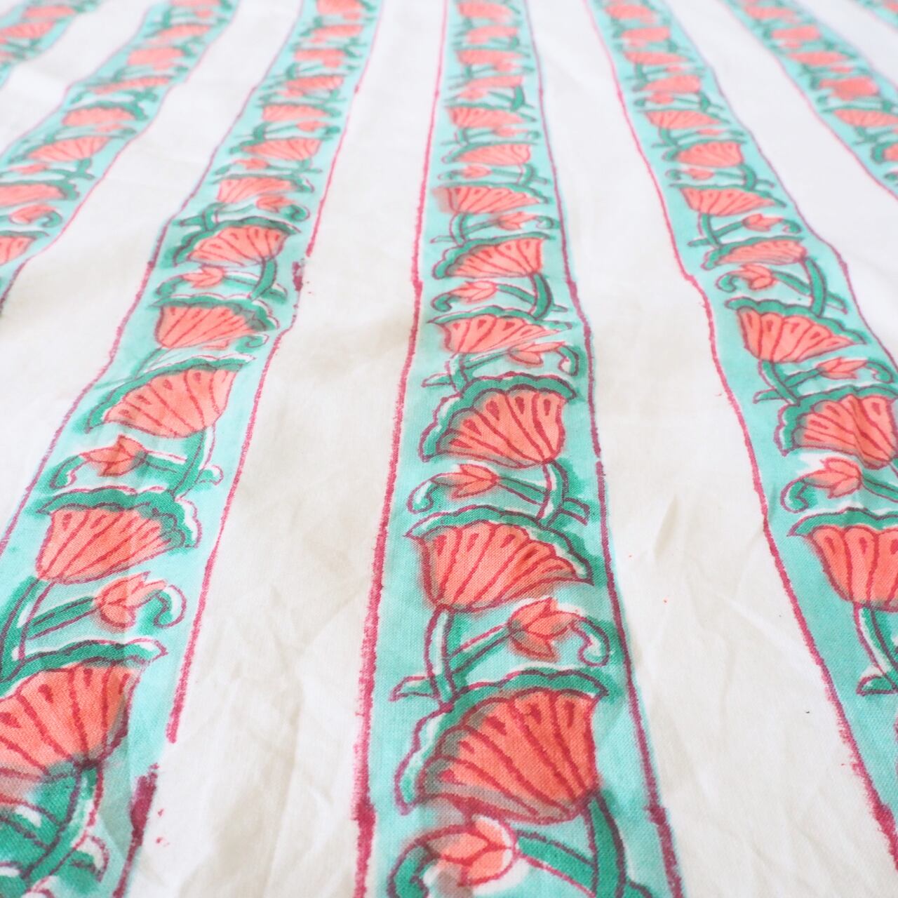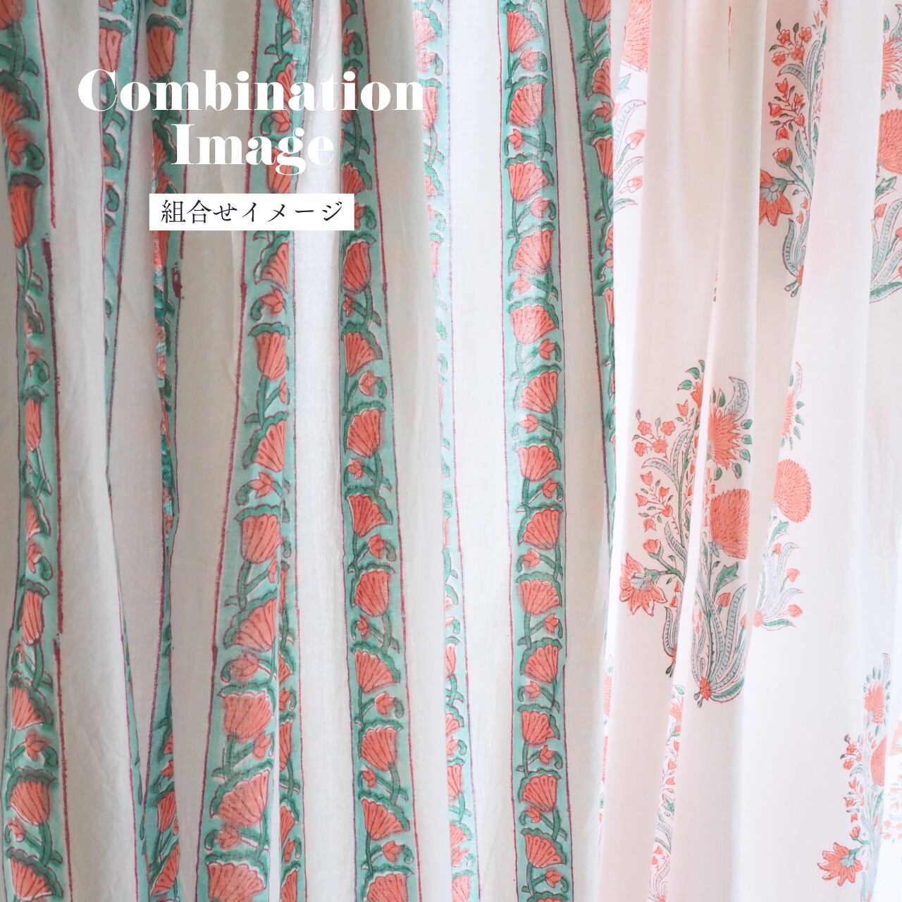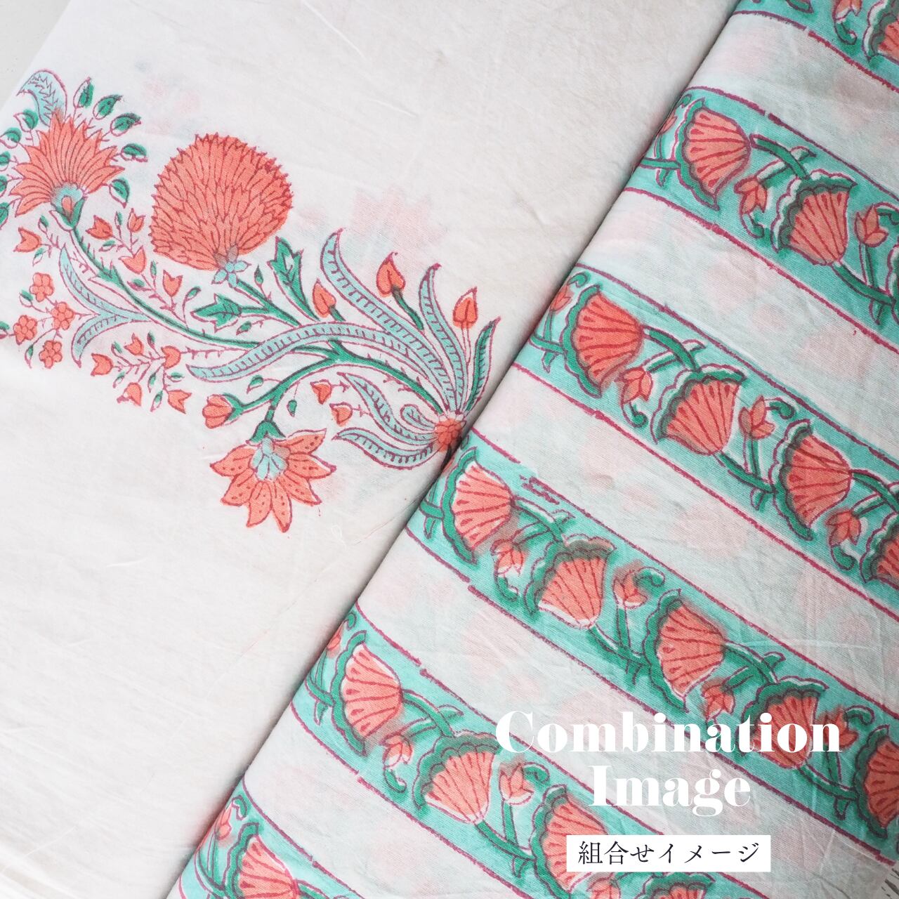 ハンドブロックプリントと呼ばれるインドのジャイプール地方に古くから伝わる伝統的な技法で、木彫りのスタンプで色を何度も重ね、全ての工程がインドの職人さんの手作業によって仕上がるAll Handmadeの生地です。