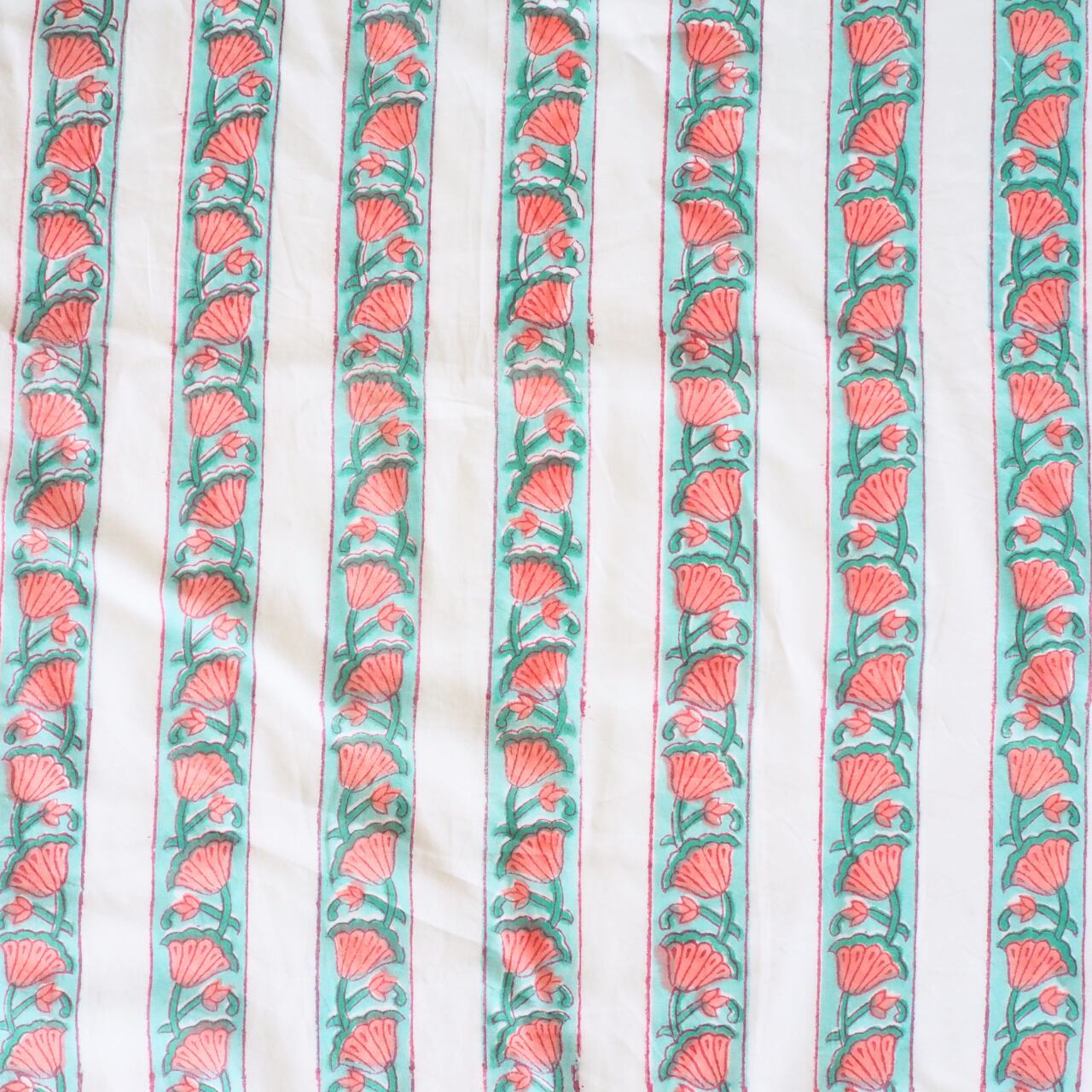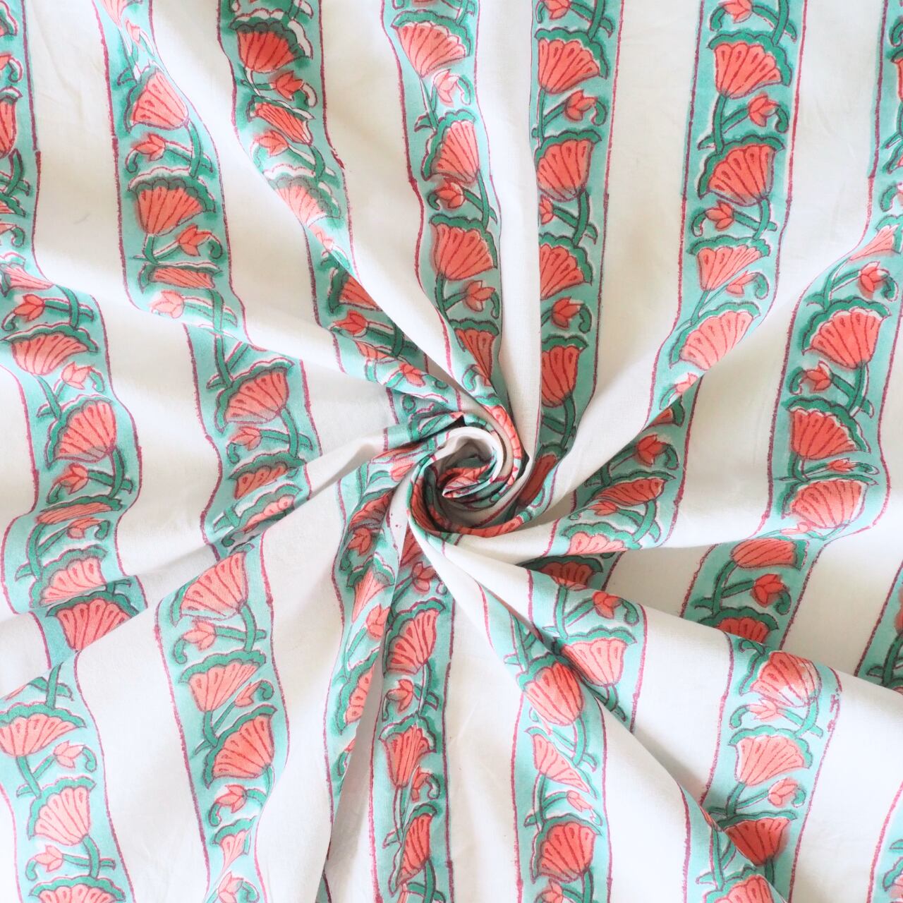 ブロックプリント生地【50cm単位】インド綿 ストライプ柄 白×ピンク×エメラルドグリーン #14218-WT2