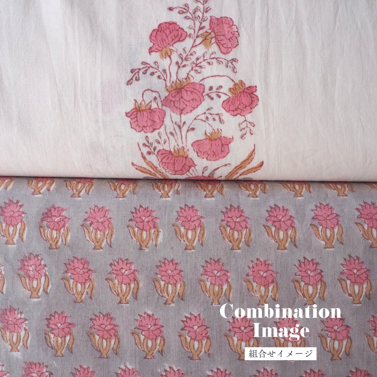 ブロックプリント生地【50cm単位】インド綿 花柄 白×ブラウン×淡ピンク #15923-PK3