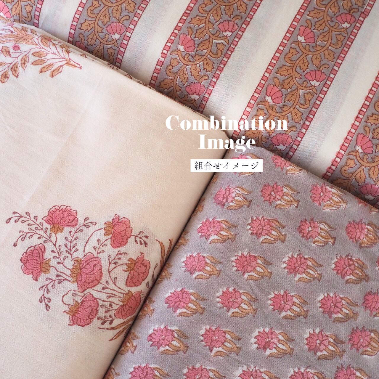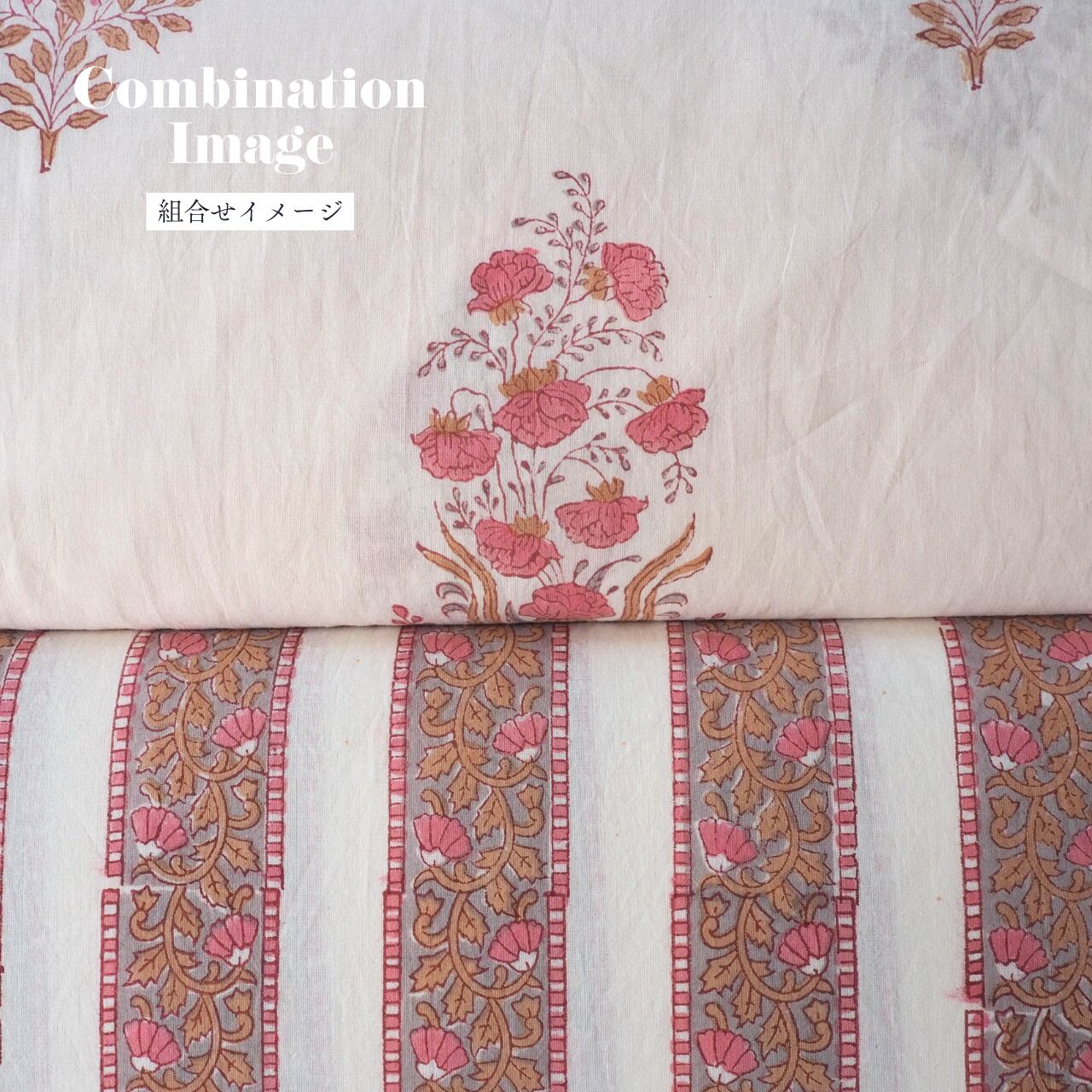 ハンドブロックプリントと呼ばれるインドのジャイプール地方に古くから伝わる伝統的な技法で、木彫りのスタンプで色を何度も重ね、全ての工程がインドの職人さんの手作業によって仕上がるAll Handmadeの生地です。