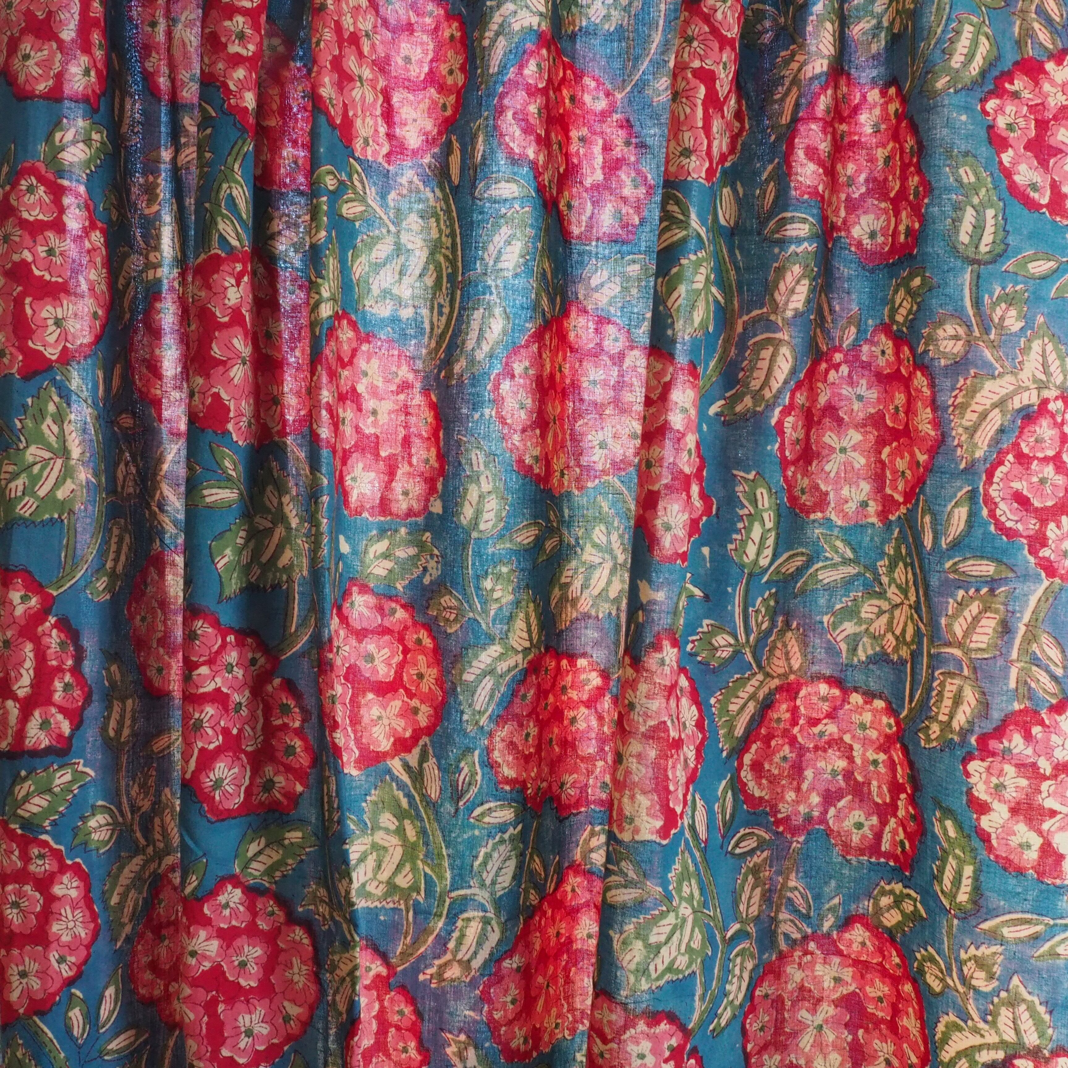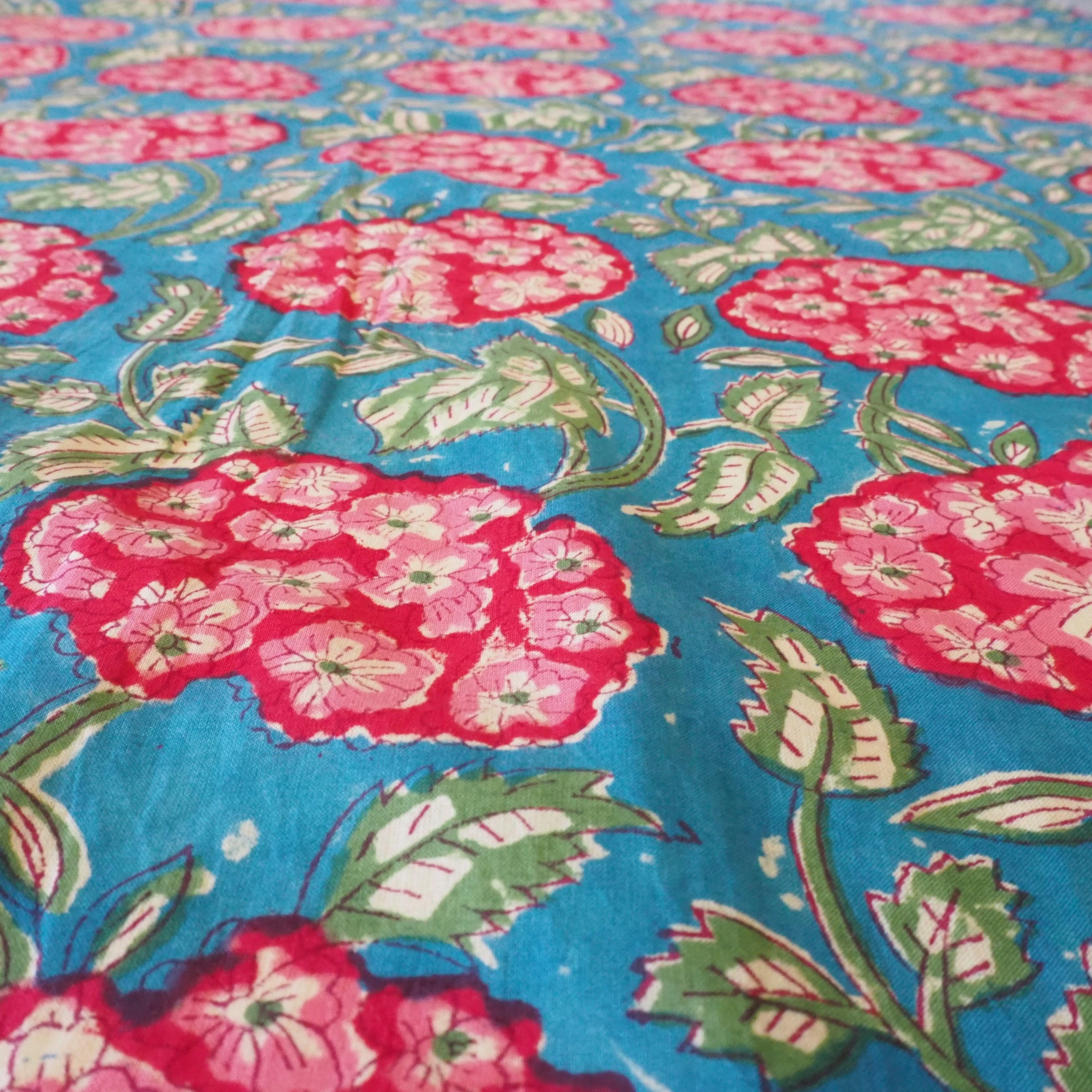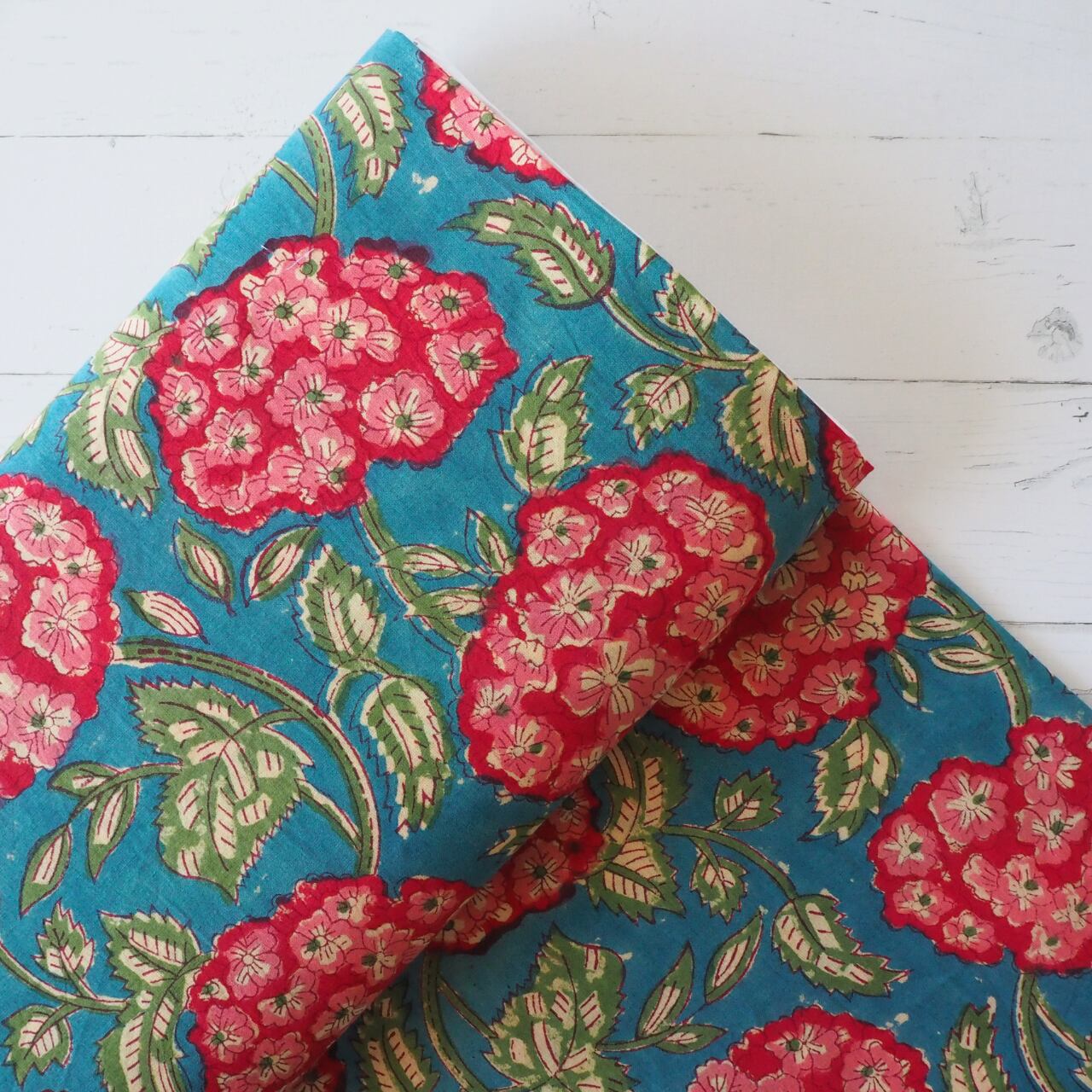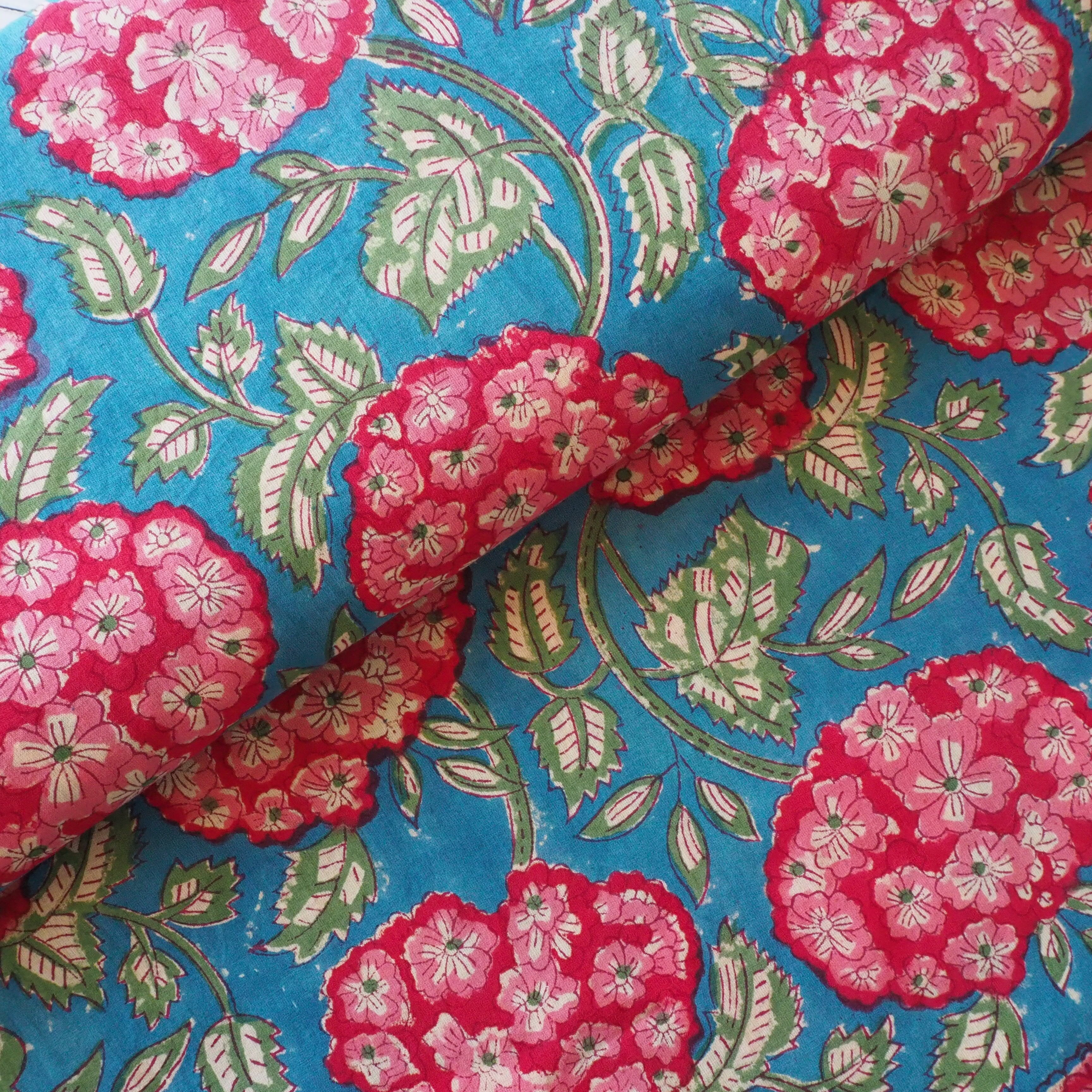 ブロックプリント生地【50cm単位】インド綿 アジサイ柄 青×ピンク×赤 #17027-BL1