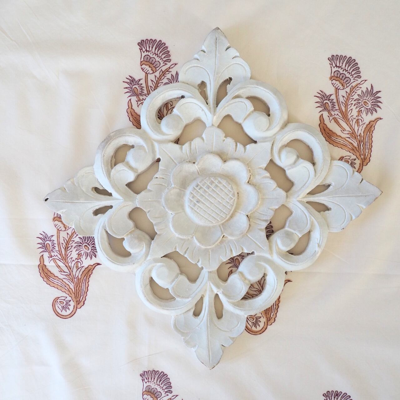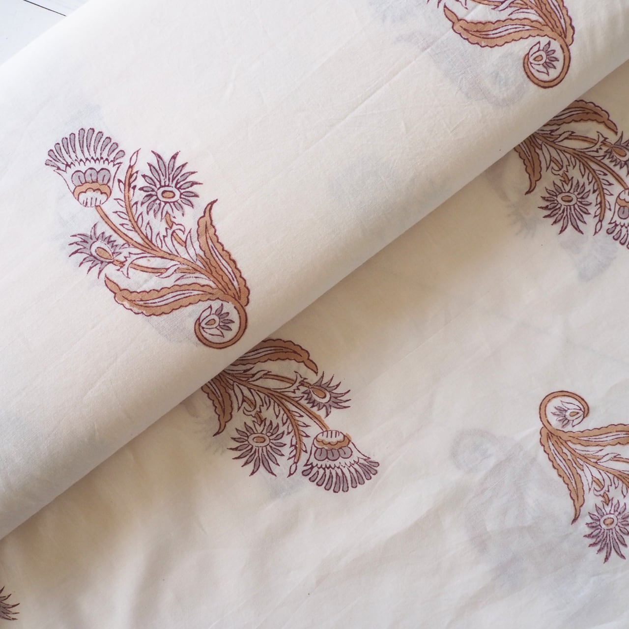 ブロックプリント生地【50cm単位】インド綿 花柄 白×グレージュ×薄茶 #16926-YL4