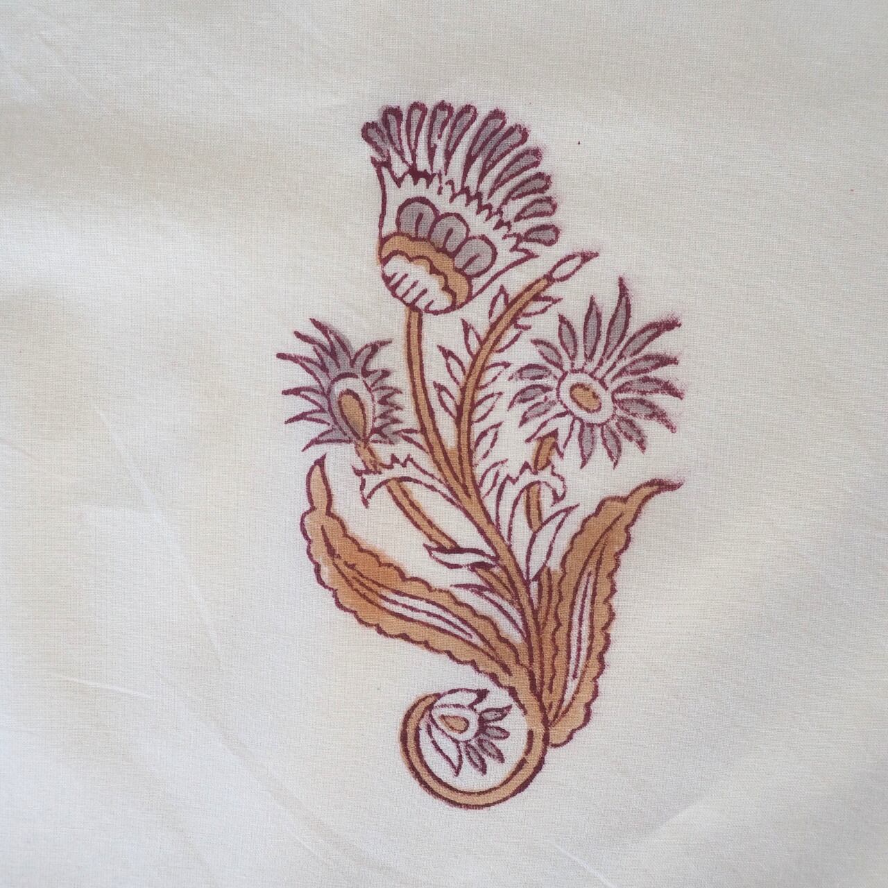 ハンドブロックプリントと呼ばれるインドのジャイプール地方に古くから伝わる伝統的な技法で、木彫りのスタンプで色を何度も重ね、全ての工程がインドの職人さんの手作業によって仕上がるAll Handmadeの生地です。